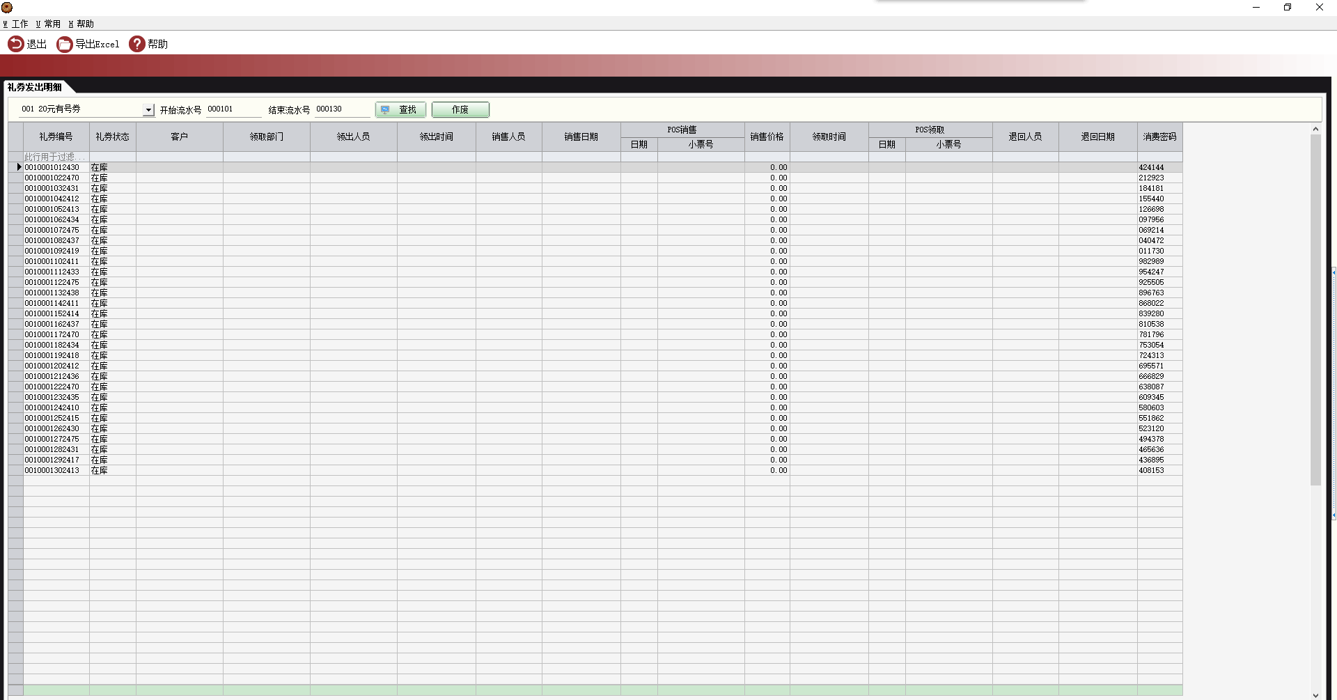 选择其他礼券类别和开始流水号、结束流水号,查询不同条件下的礼券状态,如下图: