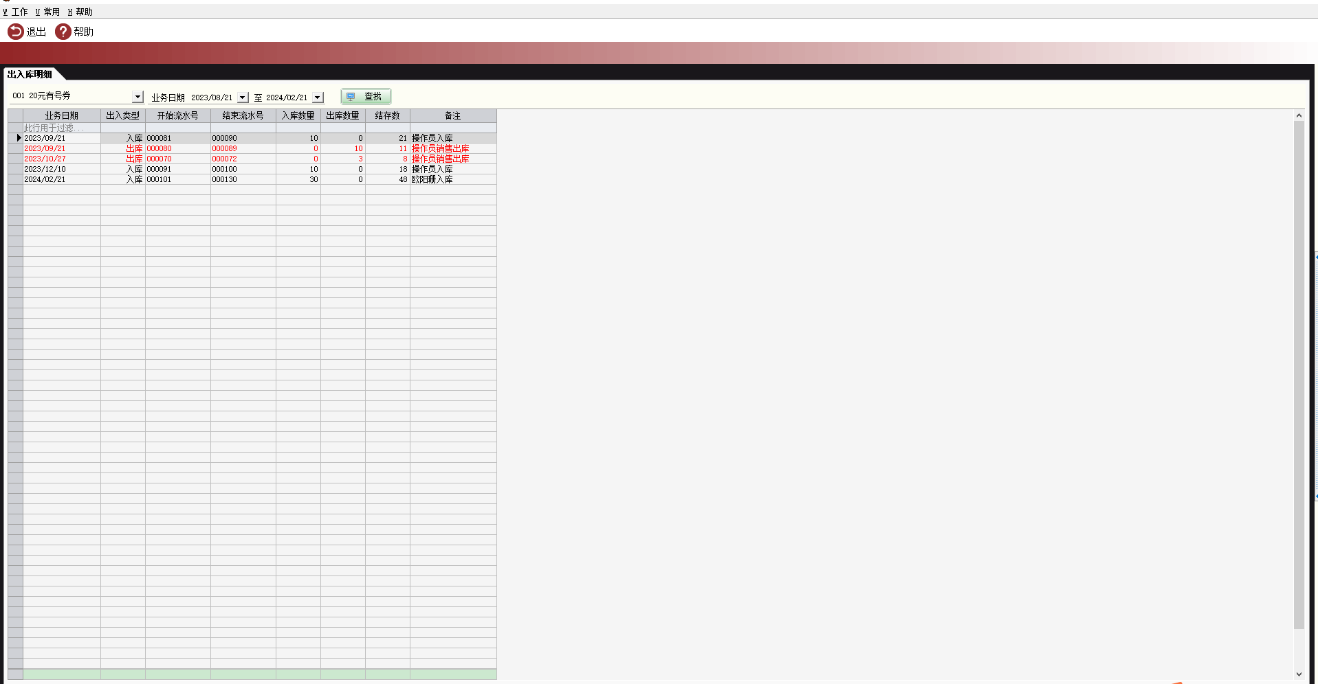 用于记录查看每类礼券的出入库操作的时间、数量、操作人员等。入库表示添加新礼券的状态,用黑色标注;出库表示礼券被领用后的状态,用红色标注。
