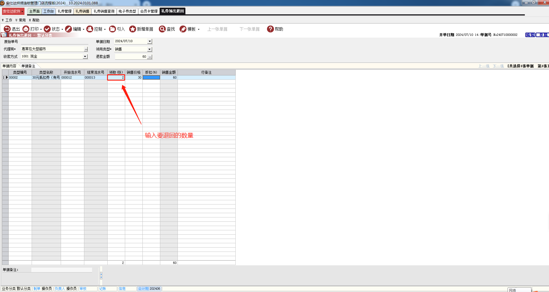 3.选择要退回的券类,从什么券号开始退回,退多少张,如图