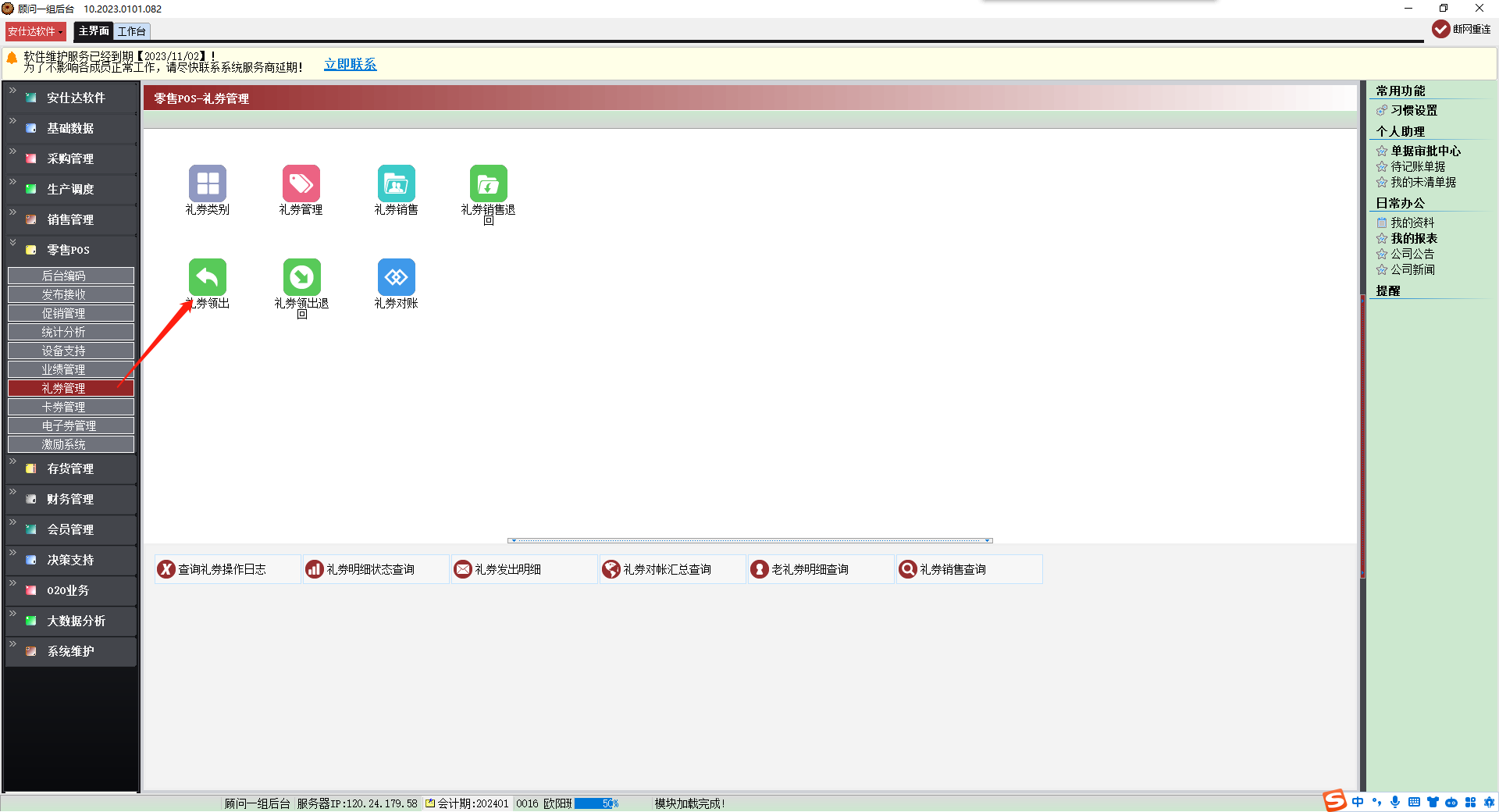 用于后台发放礼券,在此模块发放成功的礼券在礼券管理中的库存明细查询的状态会变成“已领用”,出入库明细变成“出库”状态。前台同步以后,输入礼券号可用于消费。