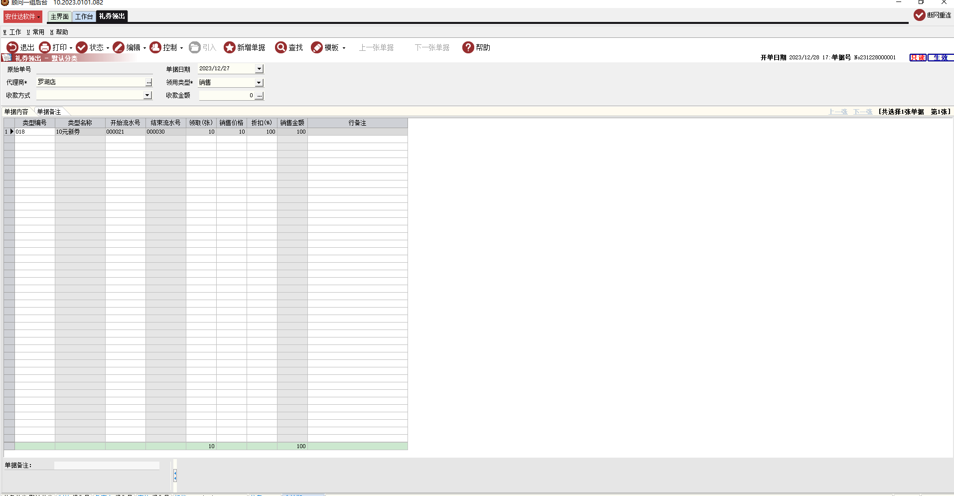 发放10元礼券10张,已知,要发放的开始礼券号为“000021”,礼券类别查到5元礼券的类别号为“018”