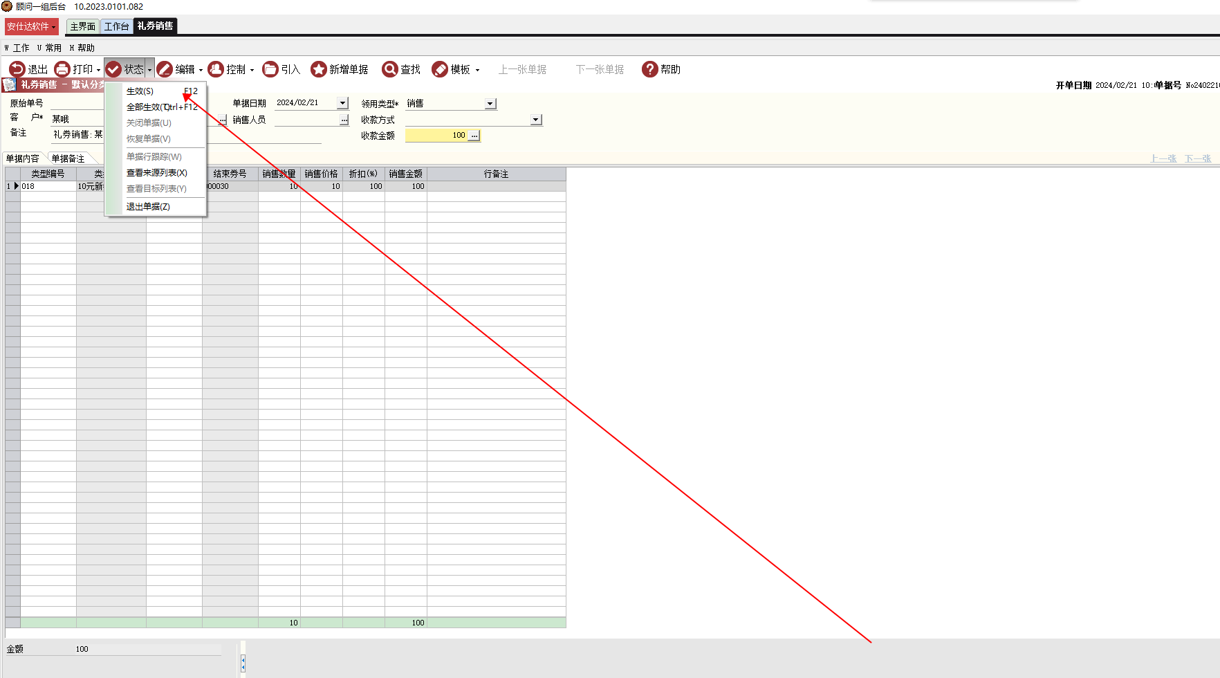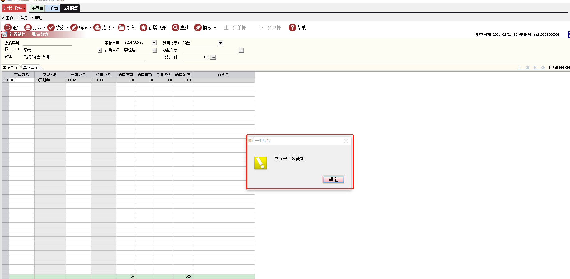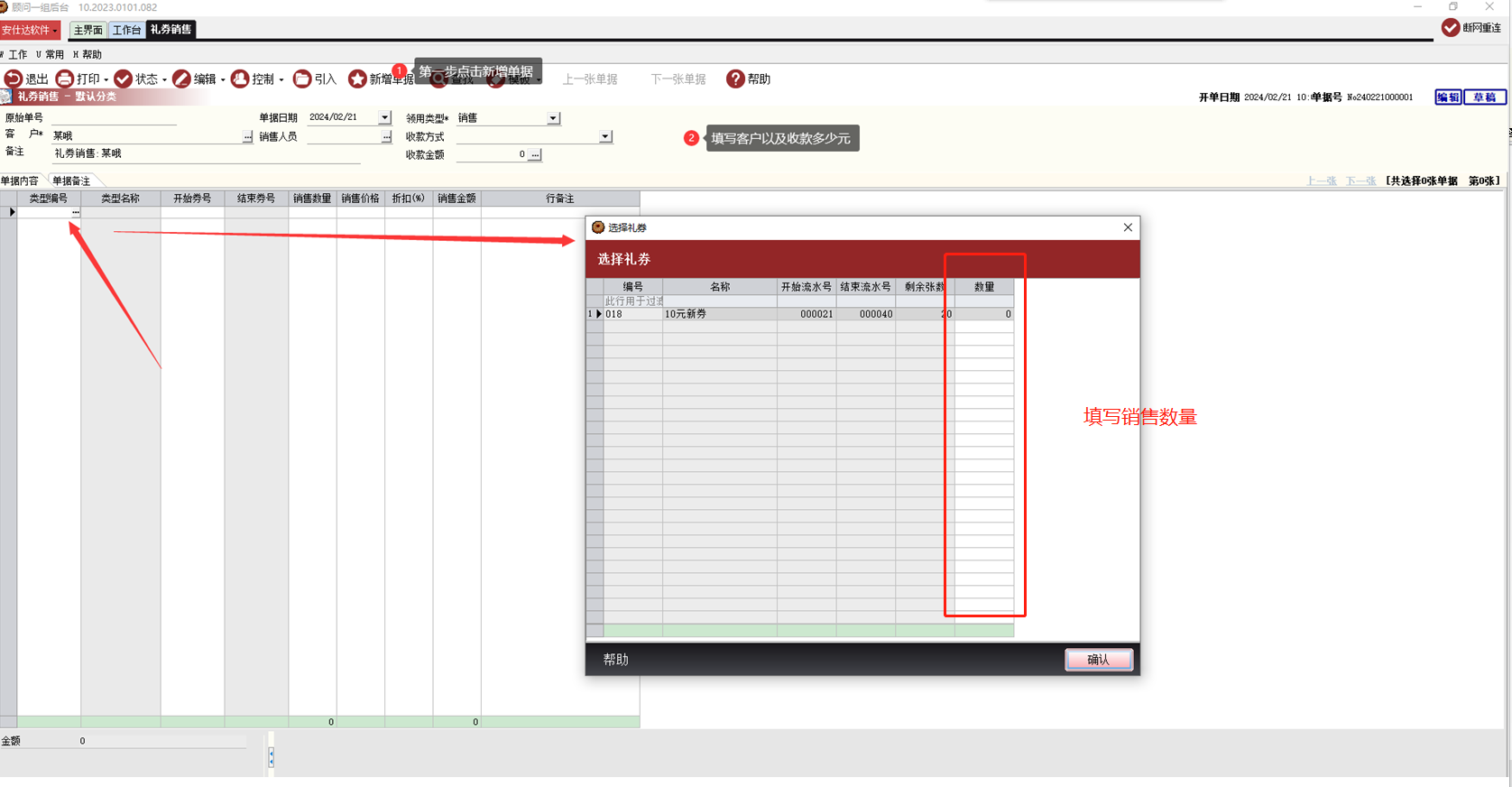 2,点击明细行的类型编号旁边的三个点,选择需要销售的礼券,填写销售数量