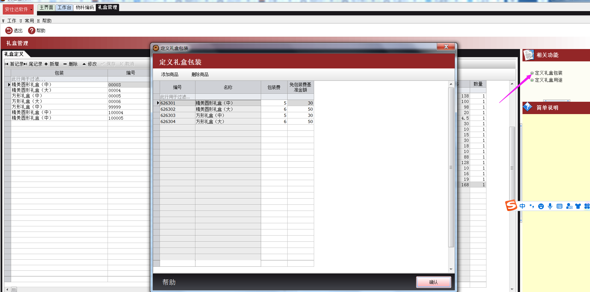 打开礼盒管理,点击右侧的定义礼盒包装,然后点击添加商品,查询出对应的礼盒包装,然后确认