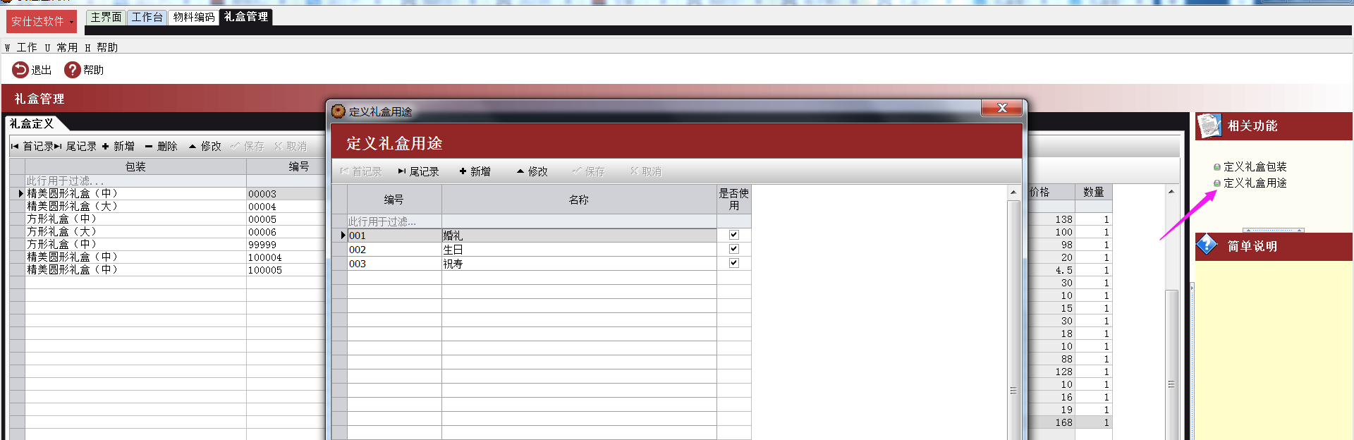 点击右侧的定义礼盒用途,点击新增,输入礼盒用途的名称,点击保存,最后勾选是否使用,在点击确认即可