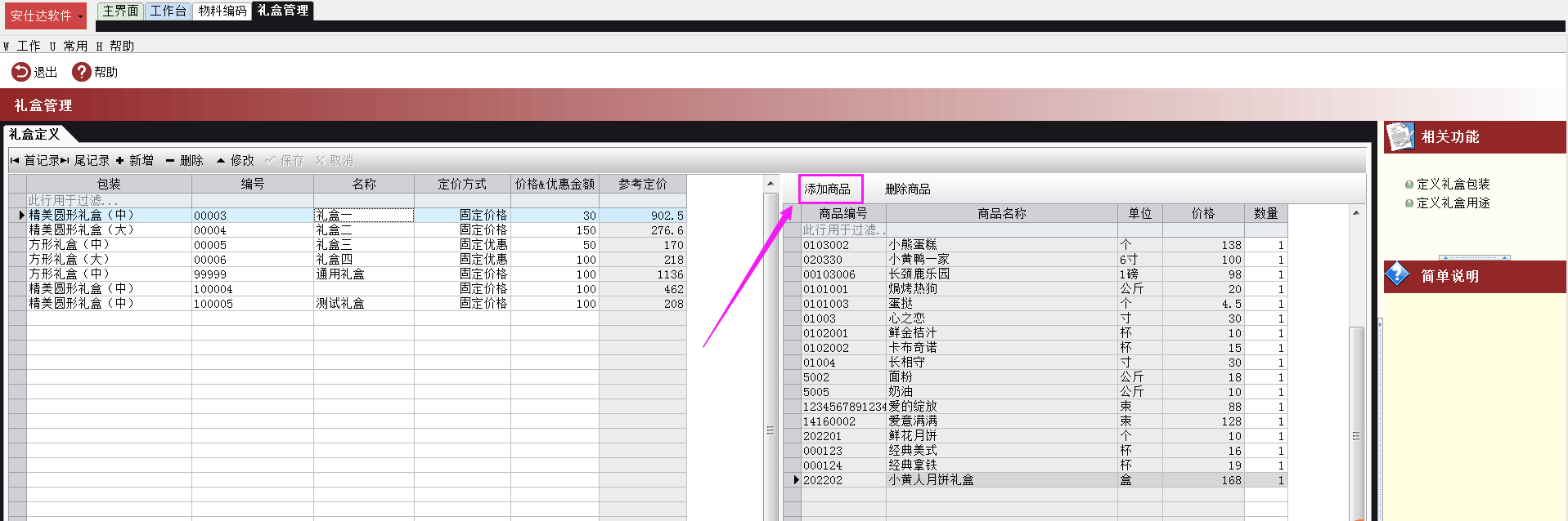 选择对应的礼盒后,点击右侧的添加商品,可以添加礼盒内的产品