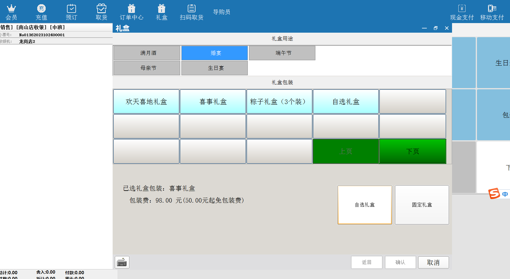⑤礼盒都定义好后,后台发布编码,门店同步重新登陆系统后,前台礼盒就可以看到礼盒内容并进行销售了