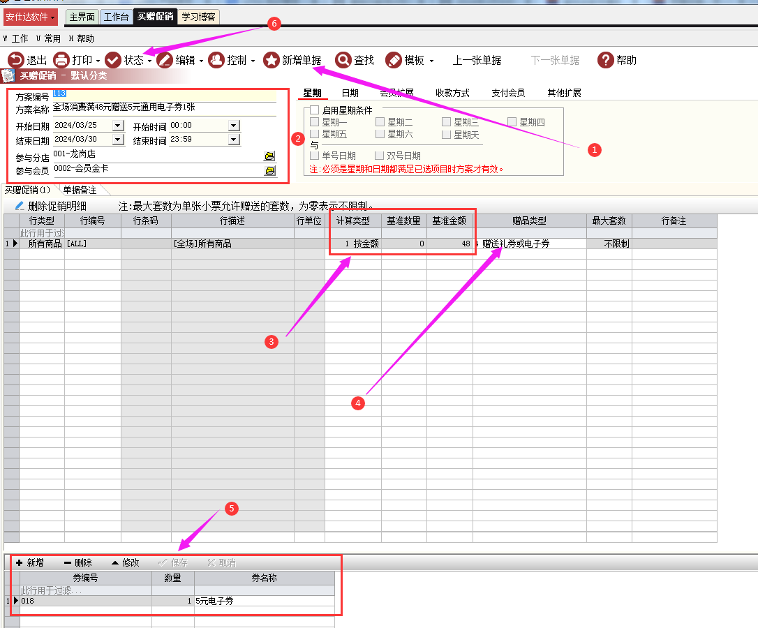 行类型选择所有商品,计算类型选择【按金额】,基准金额输入48,赠品类型选择【赠送礼券或电子券】,底部选择需要赠送的电子券以及数量
