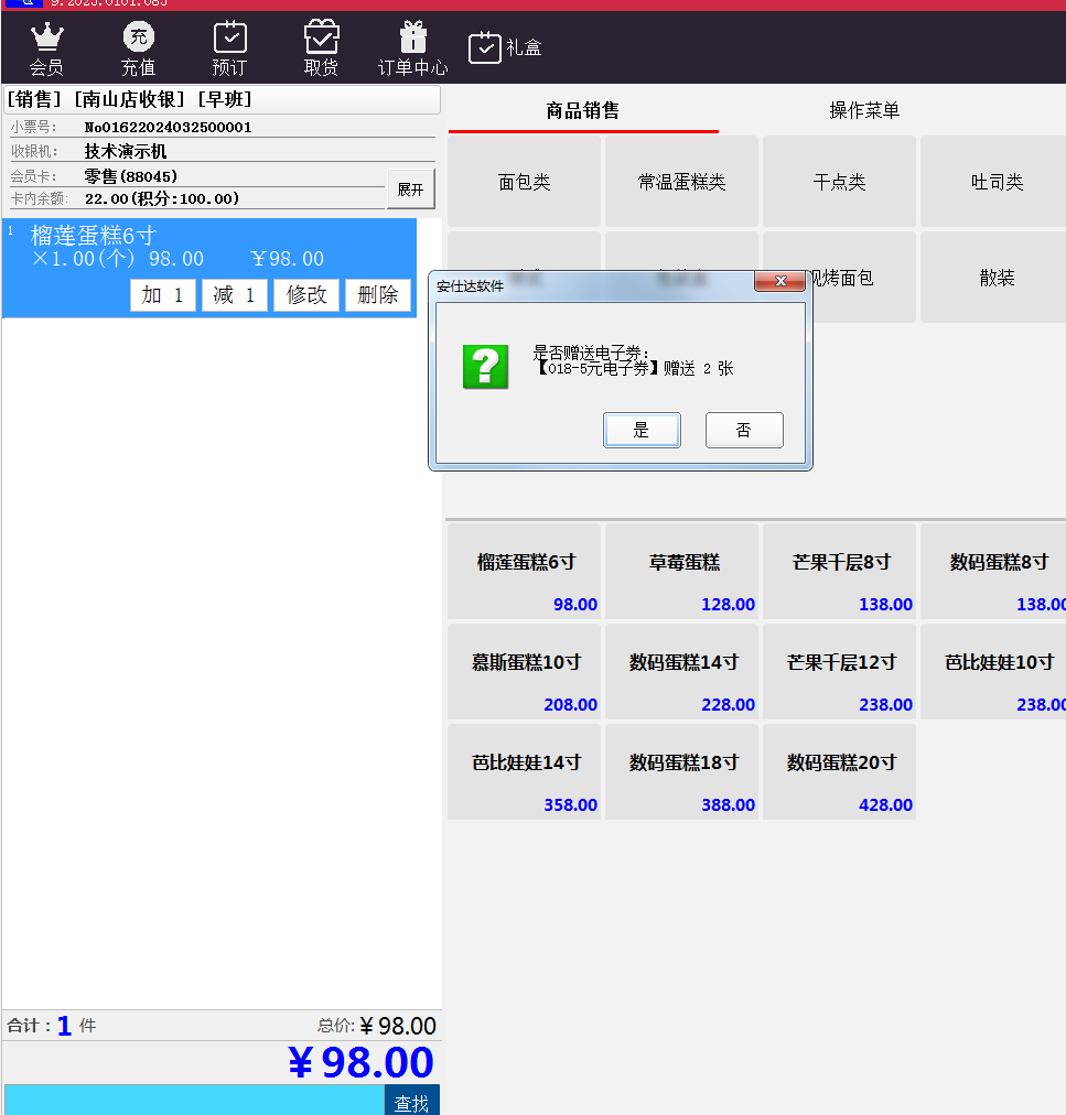 当前台消费满48元时,会自动弹出赠送电子券的提示框