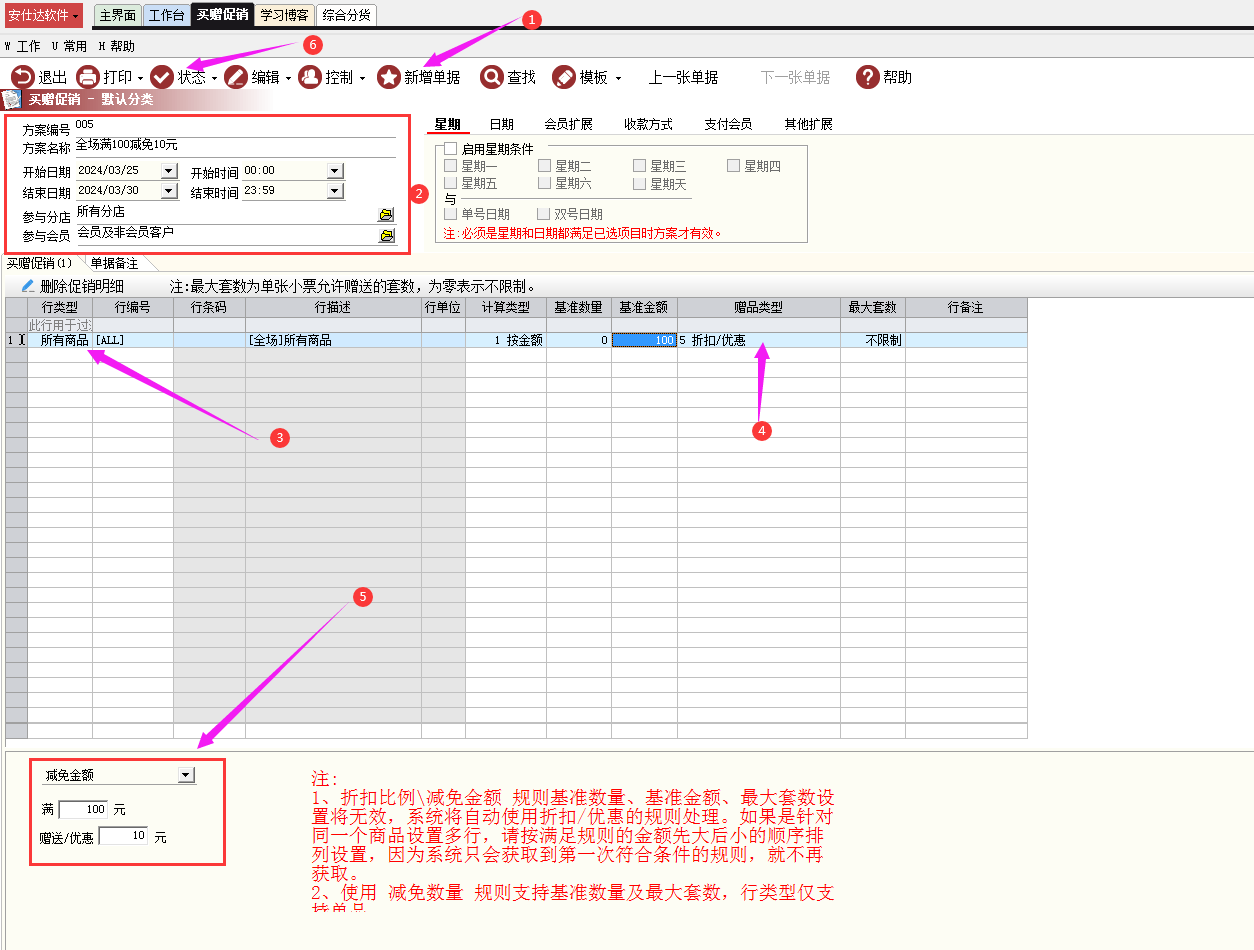 行类型选择所有商品,计算类型选择【按金额】,基准金额输入100,赠品类型选择【折扣/优惠】,底部选择【减免金额】,设置对应满减赠送的金额