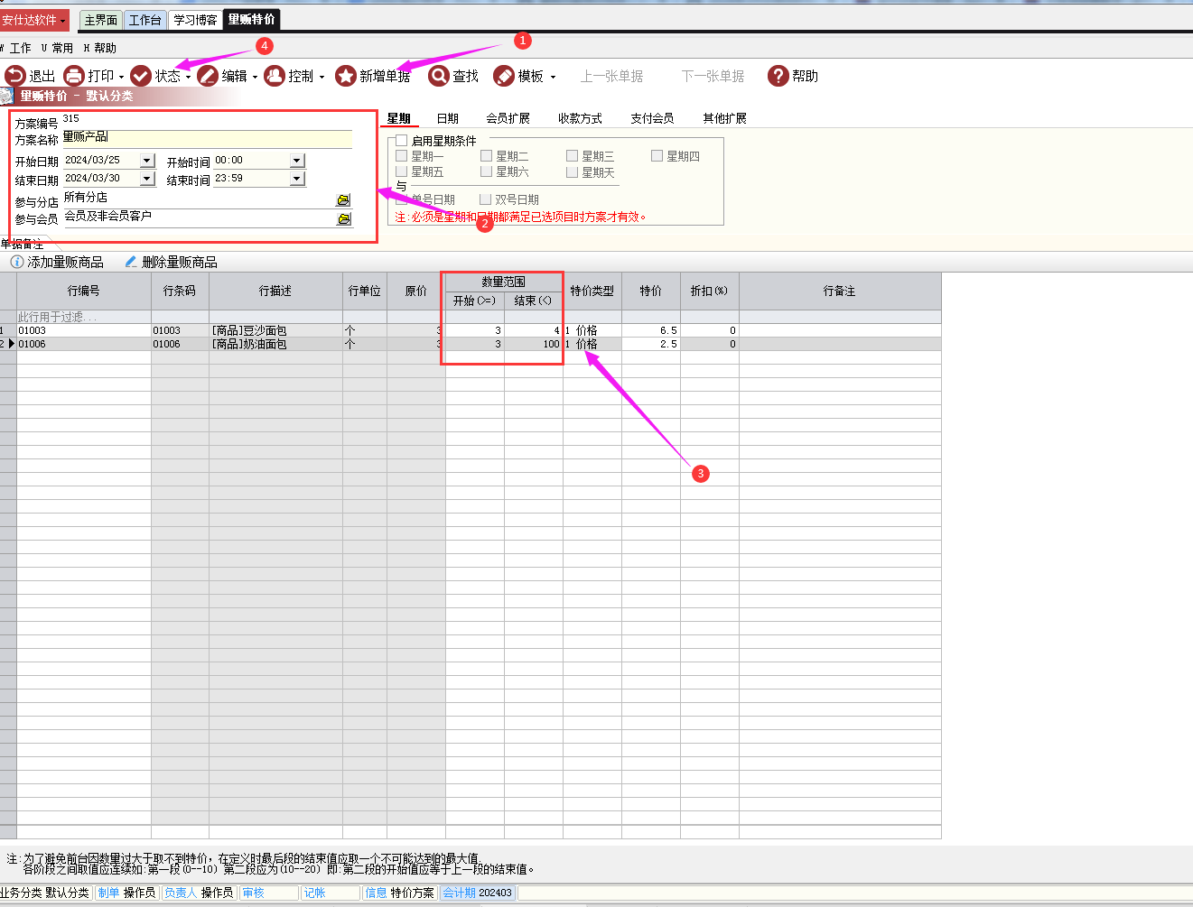 输入数量范围,选择特价类型(折扣或者特价),然后输入对应的特价或者折扣,最后点击状态,生效即可