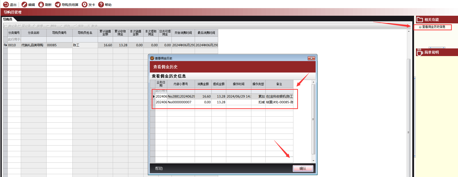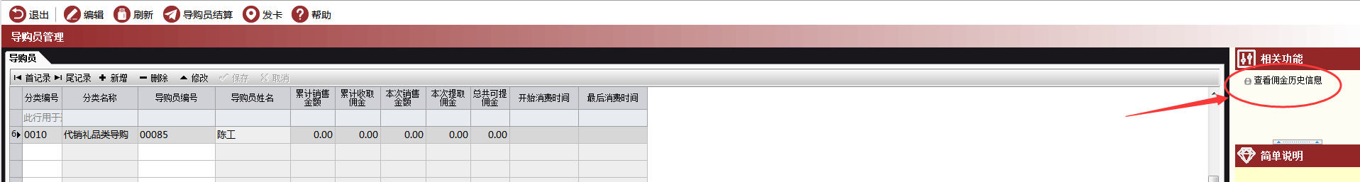 2、通过点开右侧相关功能,可以查看佣金的历史信息,可以查看过去导购员的商品佣金提成情况