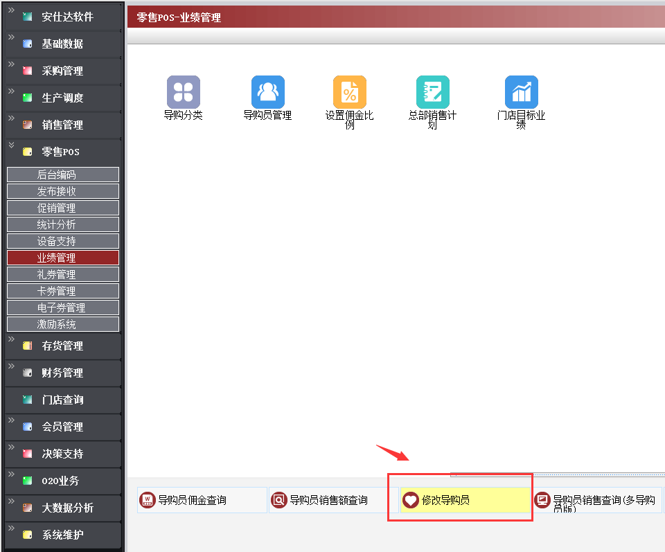 顾客选购产品后结算选择错了导购员,这个时候佣金结算错,需要调整导购员时,可以通过这个菜单操作修改正确的导购员