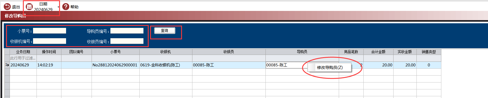 1、打开修改导购员菜单,可以通过选择小票号、导购员编号、收银机编号、收银员编号等条件进行查询小票详细记录,选择这条记录鼠标右键弹出修改导购员菜单,如下图