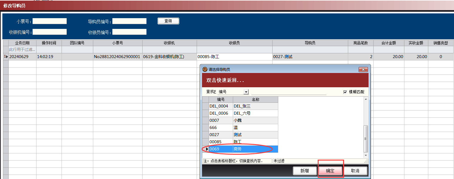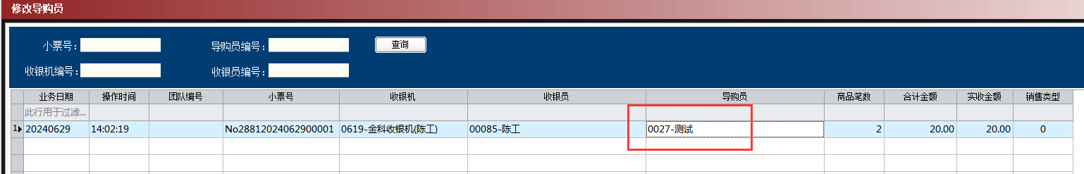 将原销售的小票绑定的导购员0027修改成0069,如图