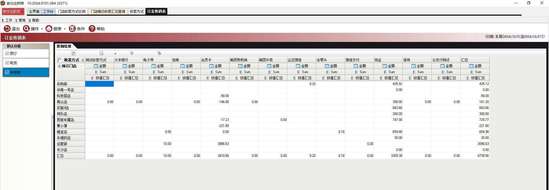 注意事项:当天有历史订单取货,可能会导致未核销金额出现负数情况,这个是正常的。举例,当天没有预定收入,然后有历史订单取货。这里未核销金额就会出现负数。