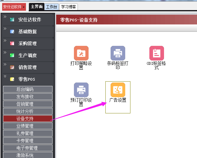 ①按照路径,零售POS->设备支持->广告设置,打开广告设置页面