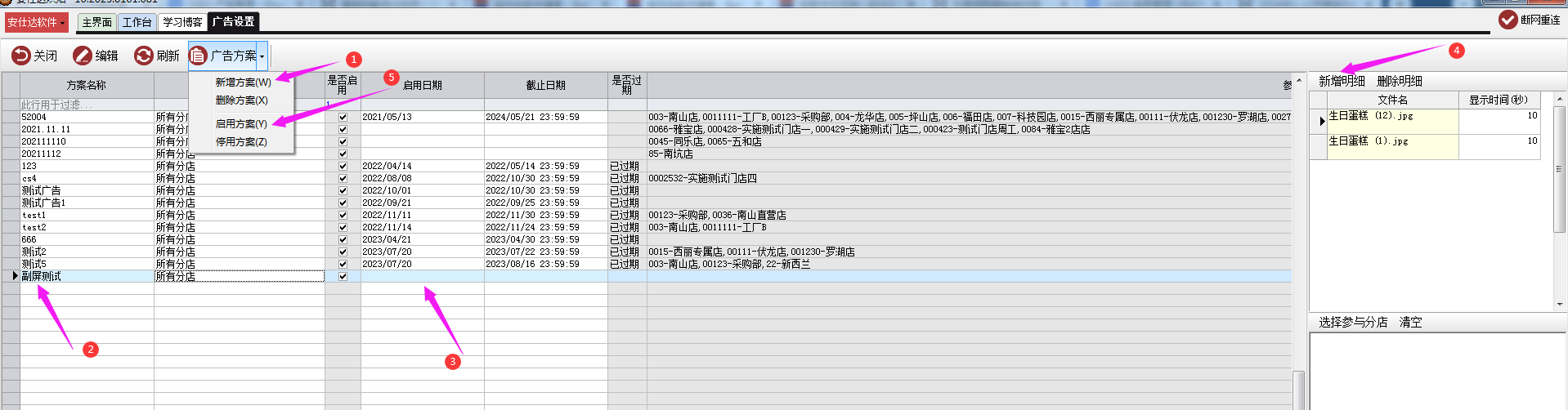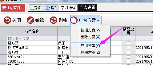 ⑤最后点击广告方案,在点击启用方案,然后后台发布编码,让门店退出系统重新登陆就可以了