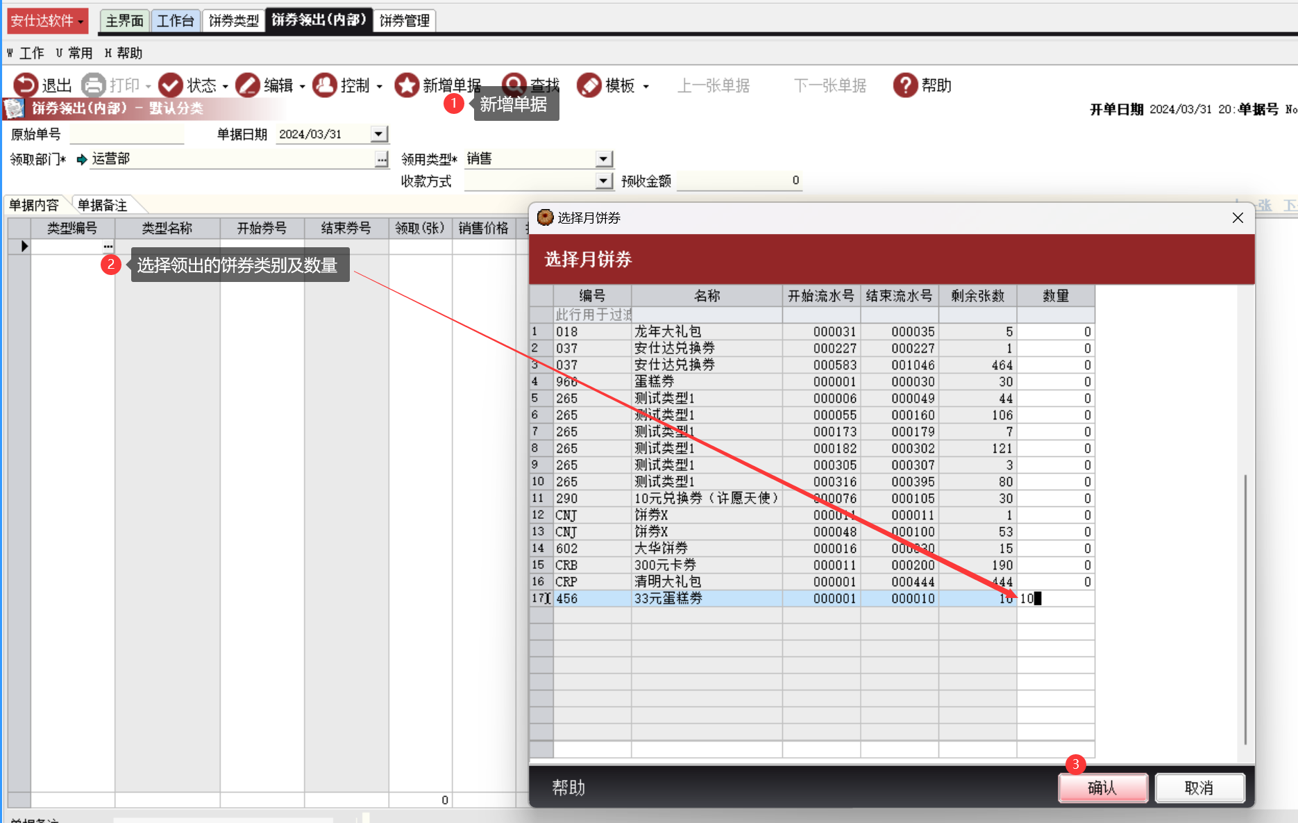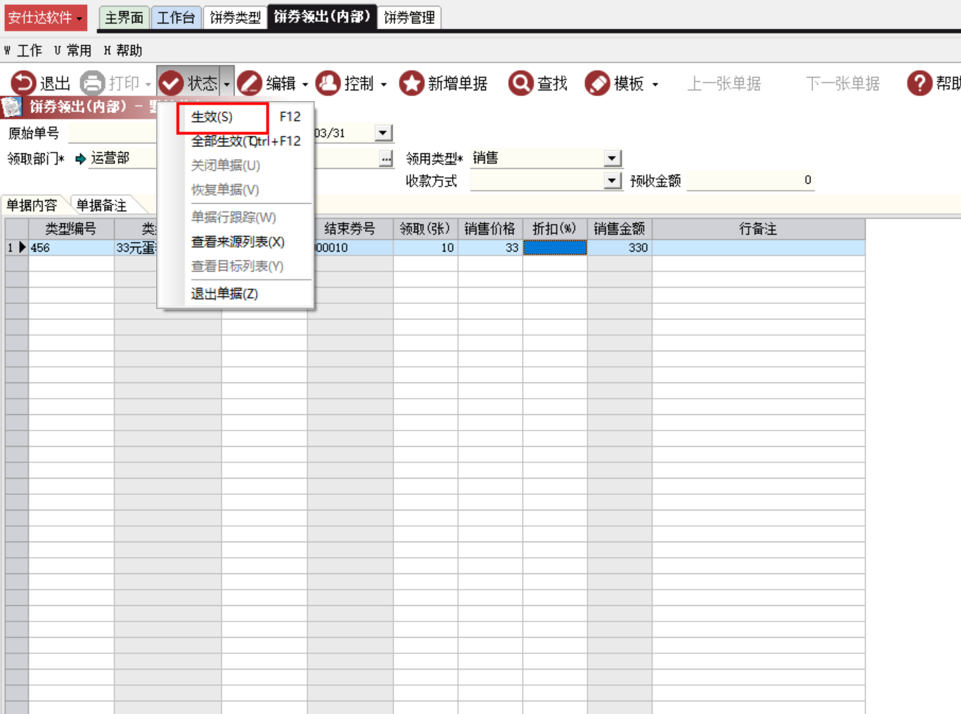 如:选择领用类型为“33元蛋糕劵”的饼券,开始券号:000001,领用数量为10.则算出结束券号000010,生效完毕,该000001至000010的10张饼券已领出.即这10张饼券就可在内部销售后再在前台兑换给客户(下面详细说明)
