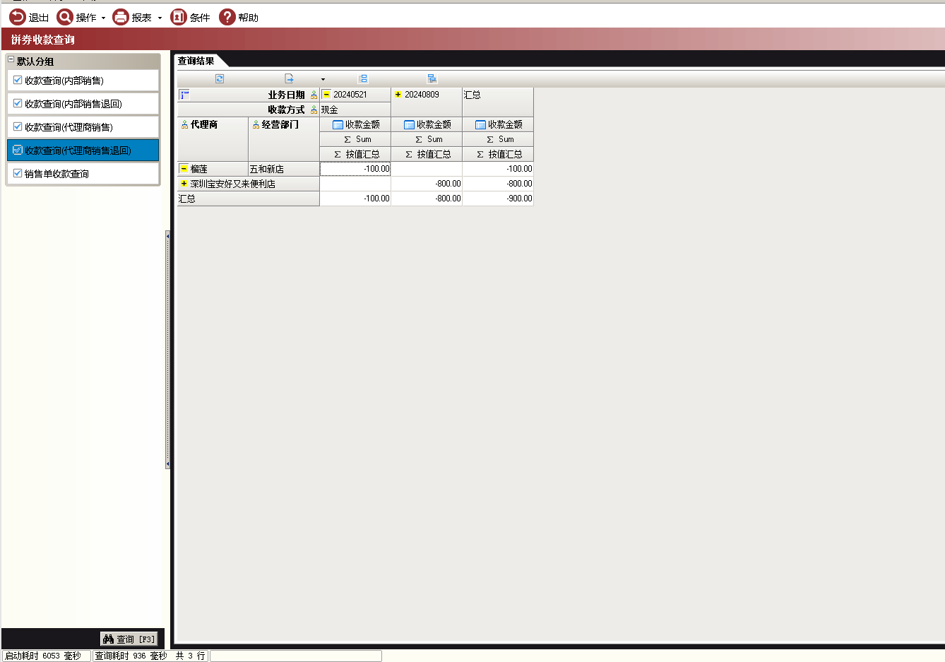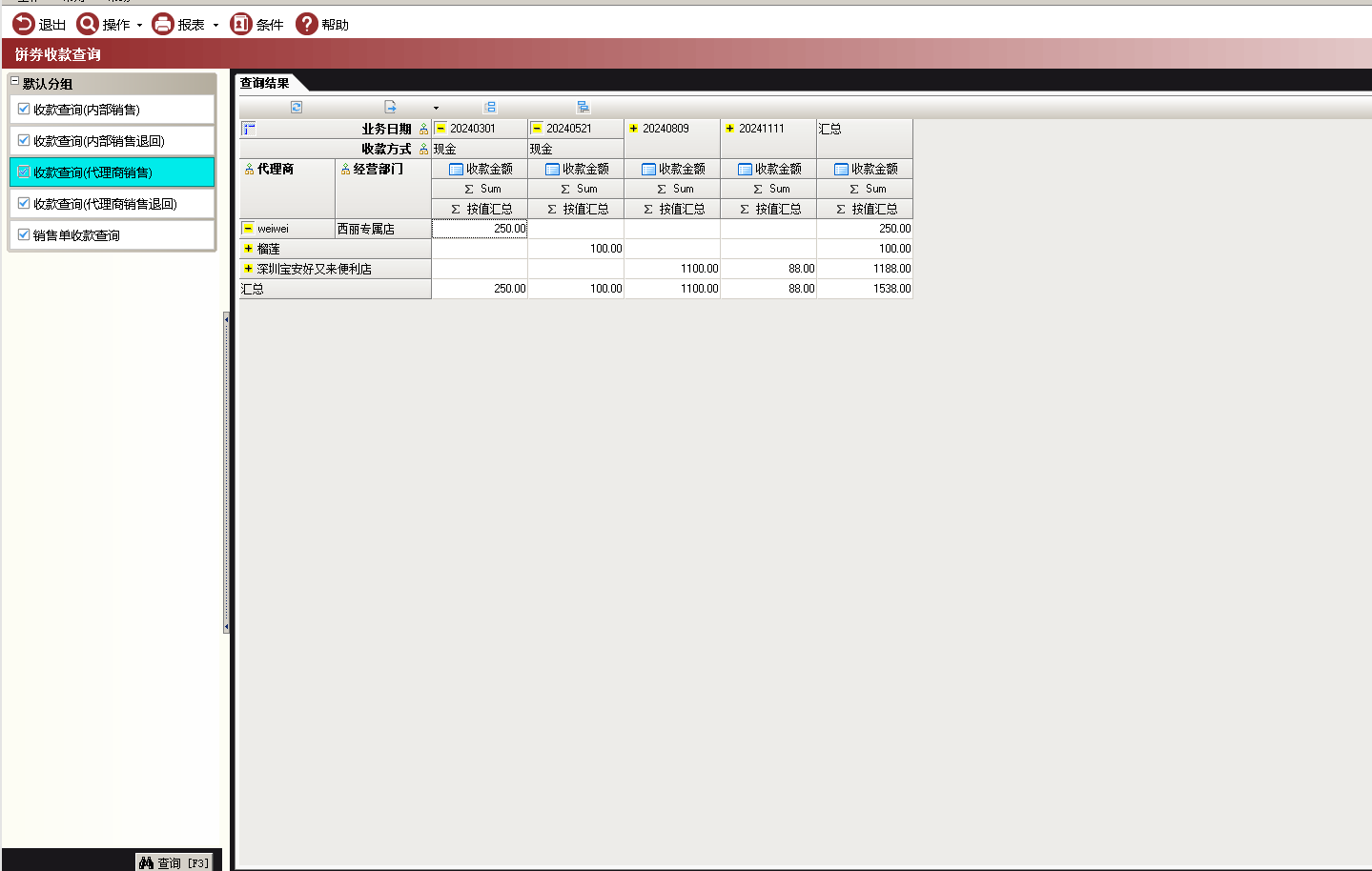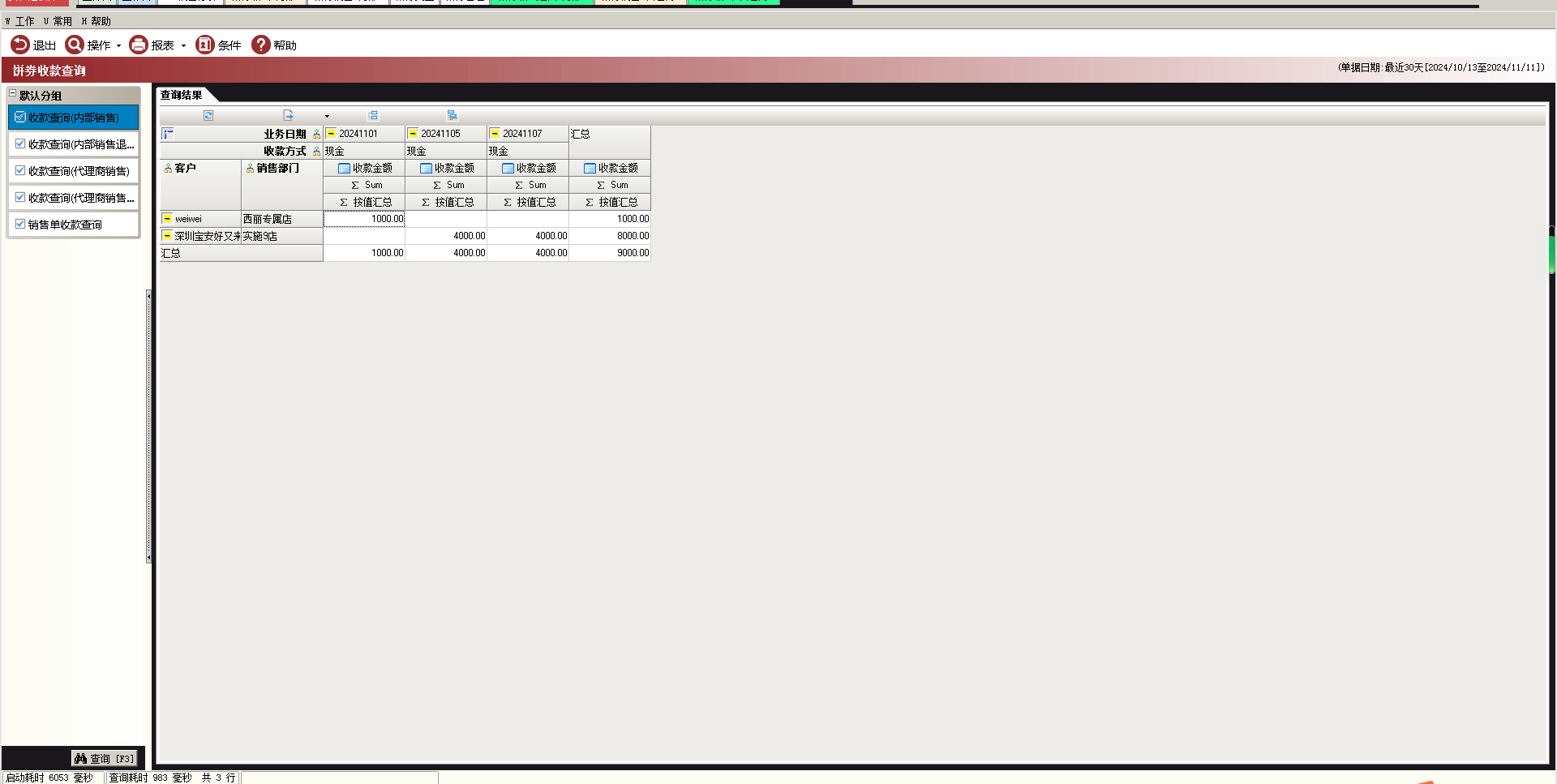 用于查询饼券销售的收款金额状况,包括汇总数据以及明细记录