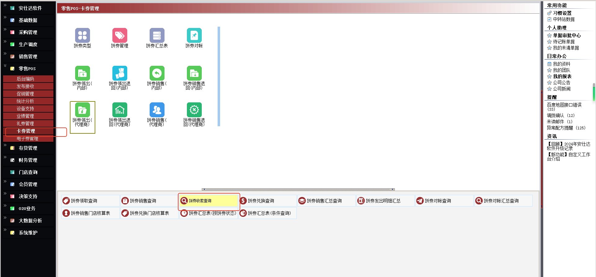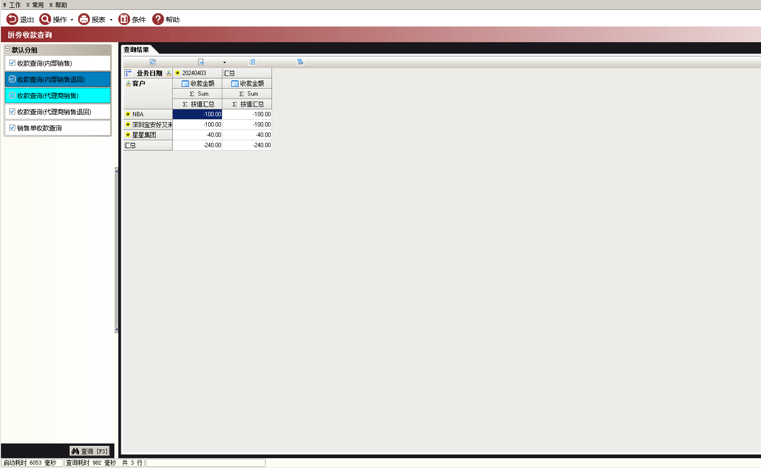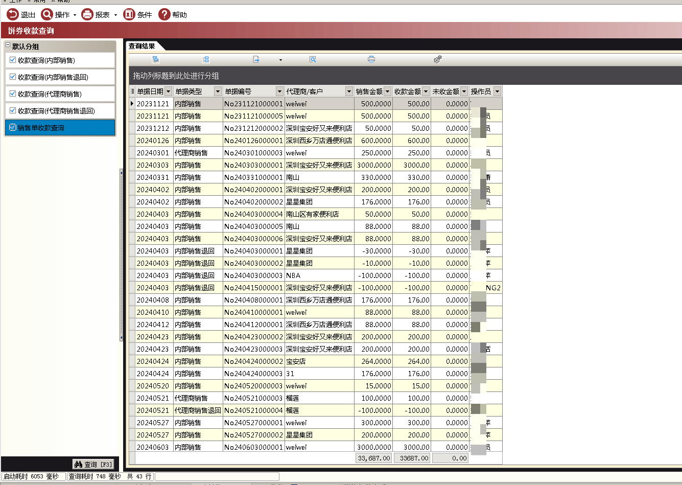 用于查询饼券销售的收款金额状况,包括汇总数据以及明细记录