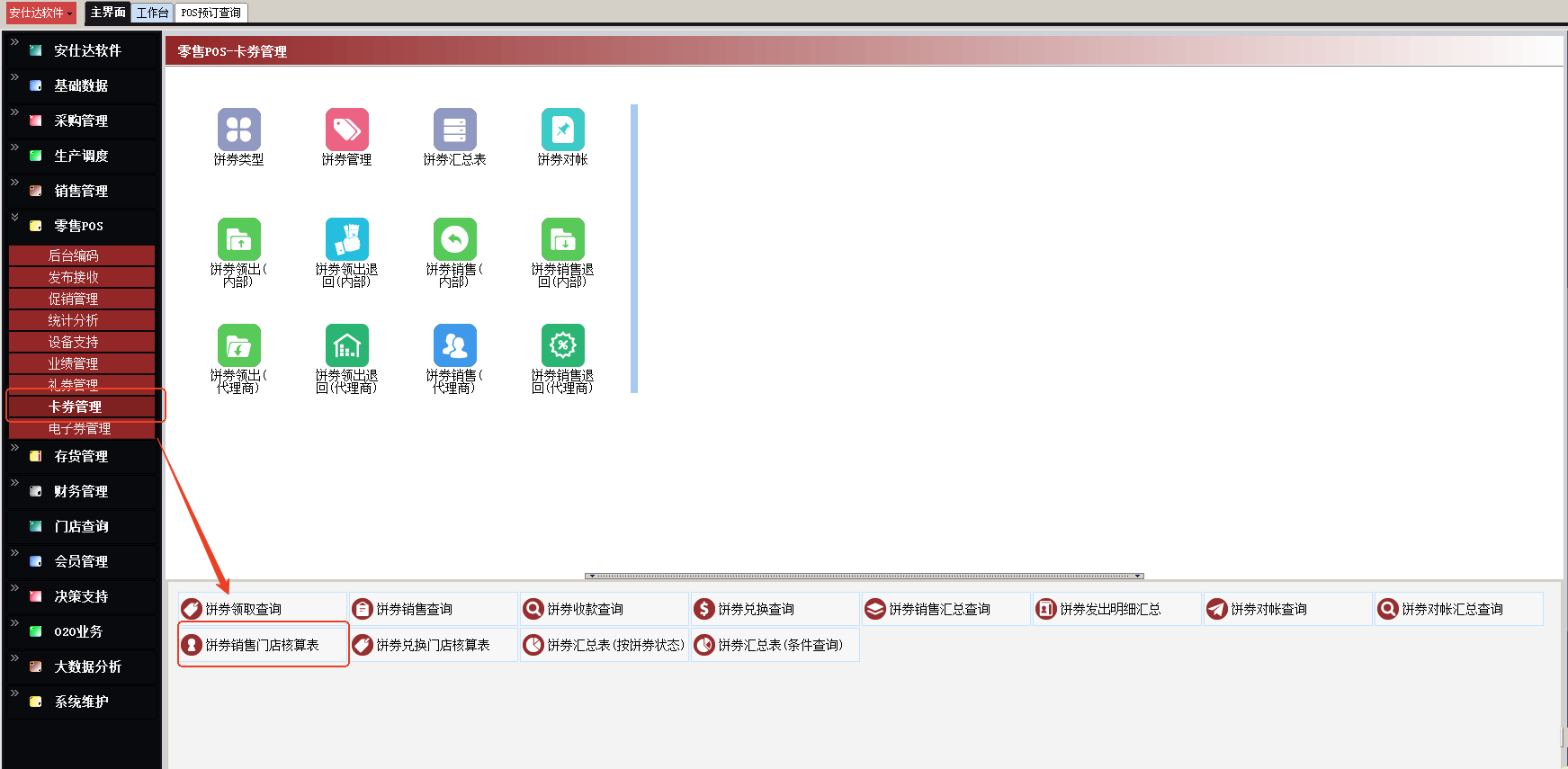 路径:零售pos-卡券管理-饼券销售门店核算表