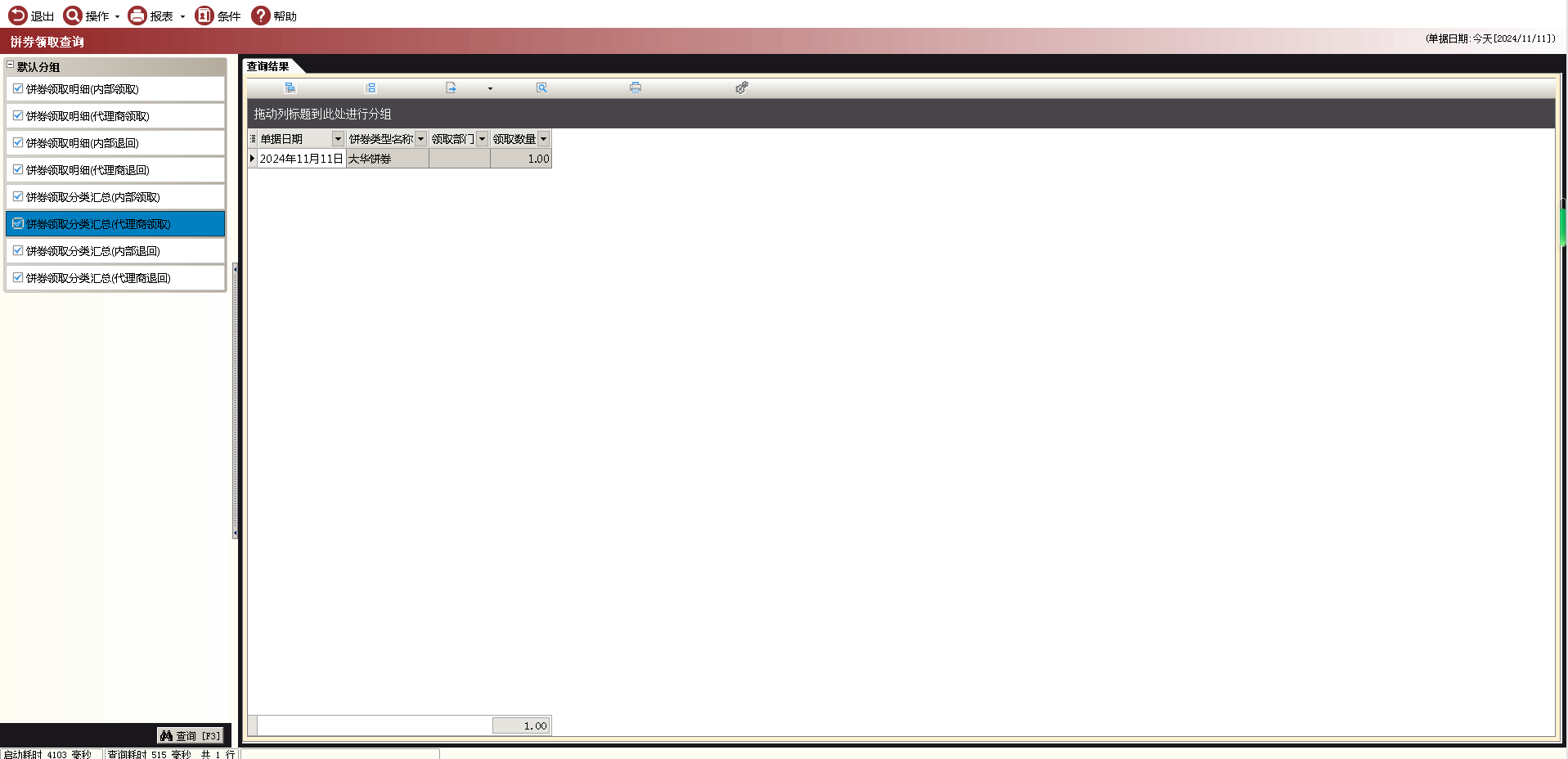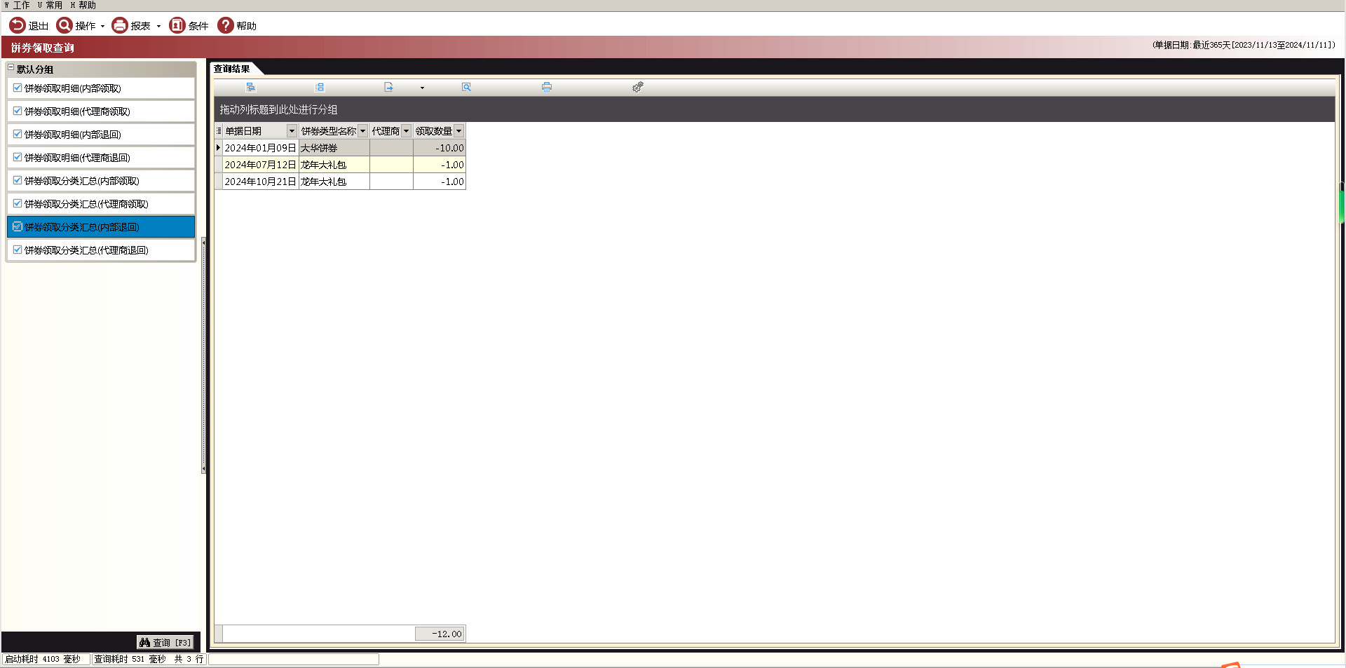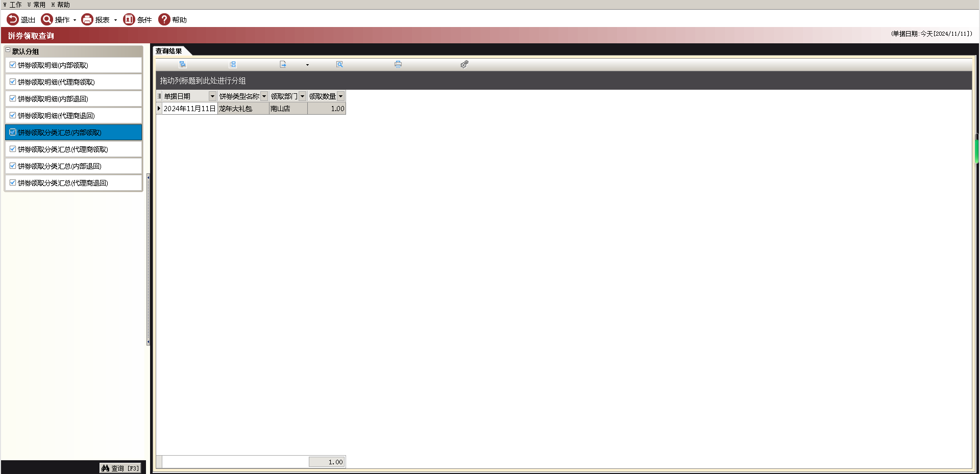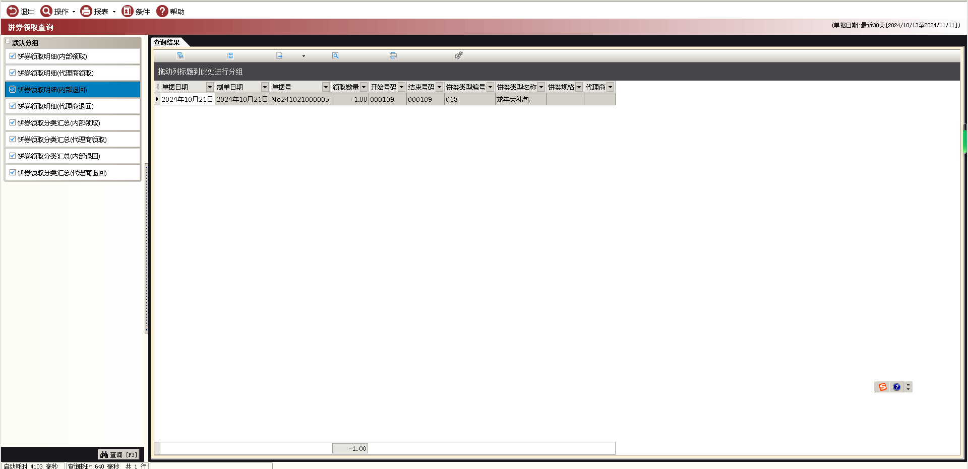 用于查询饼券及其分类的领取与退回情况,涵盖领取时间、数量以及领用部门等关键数据