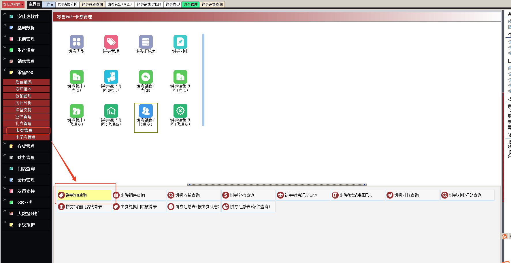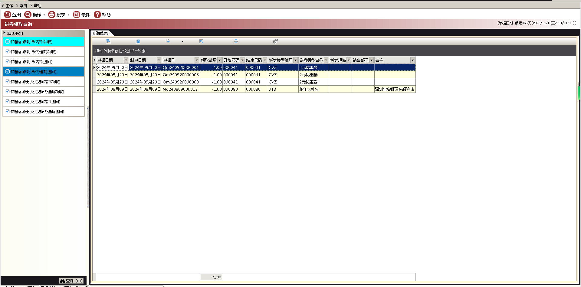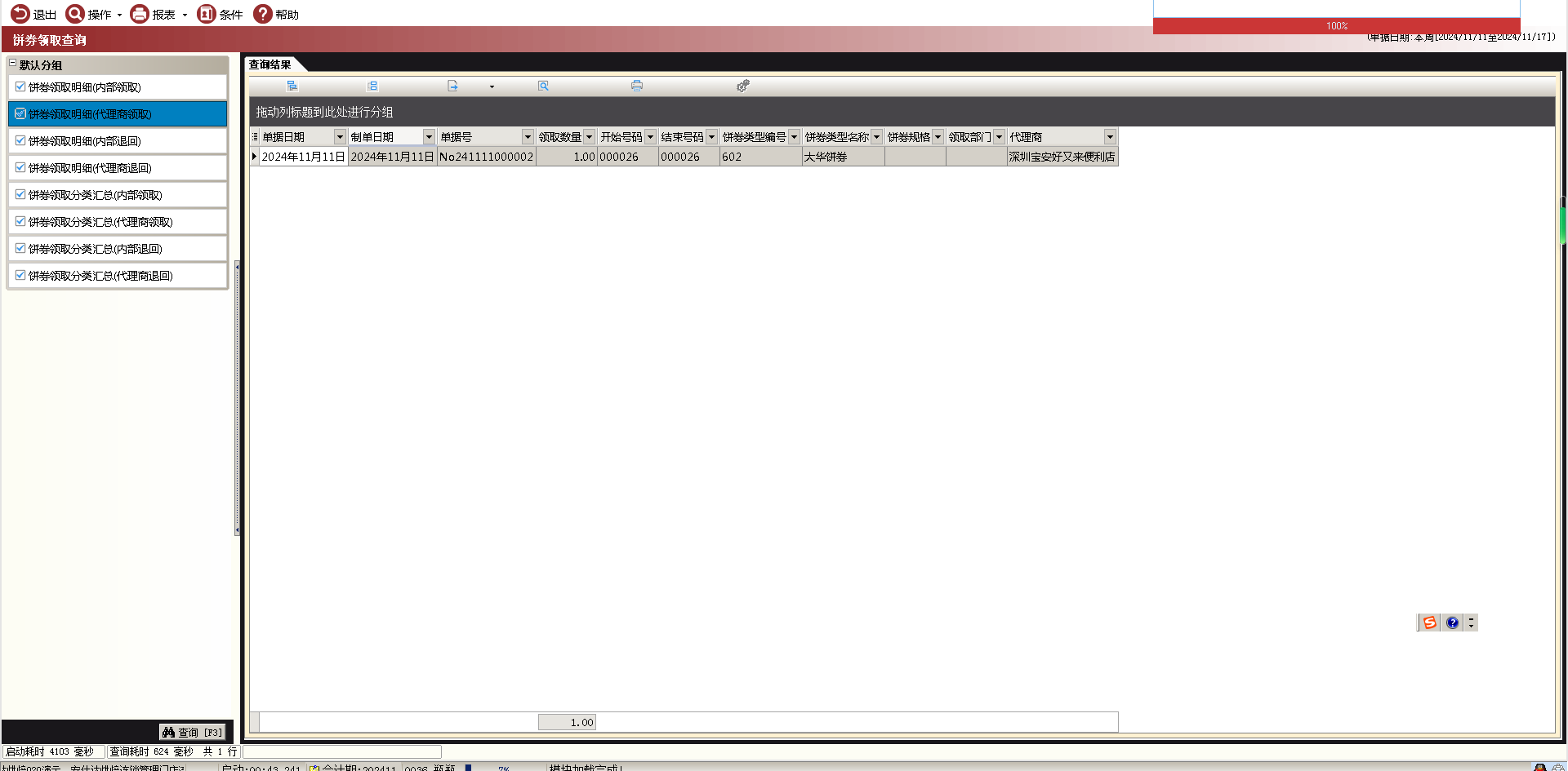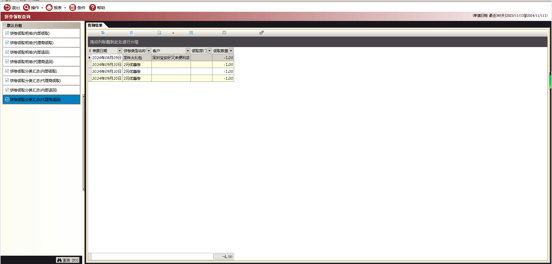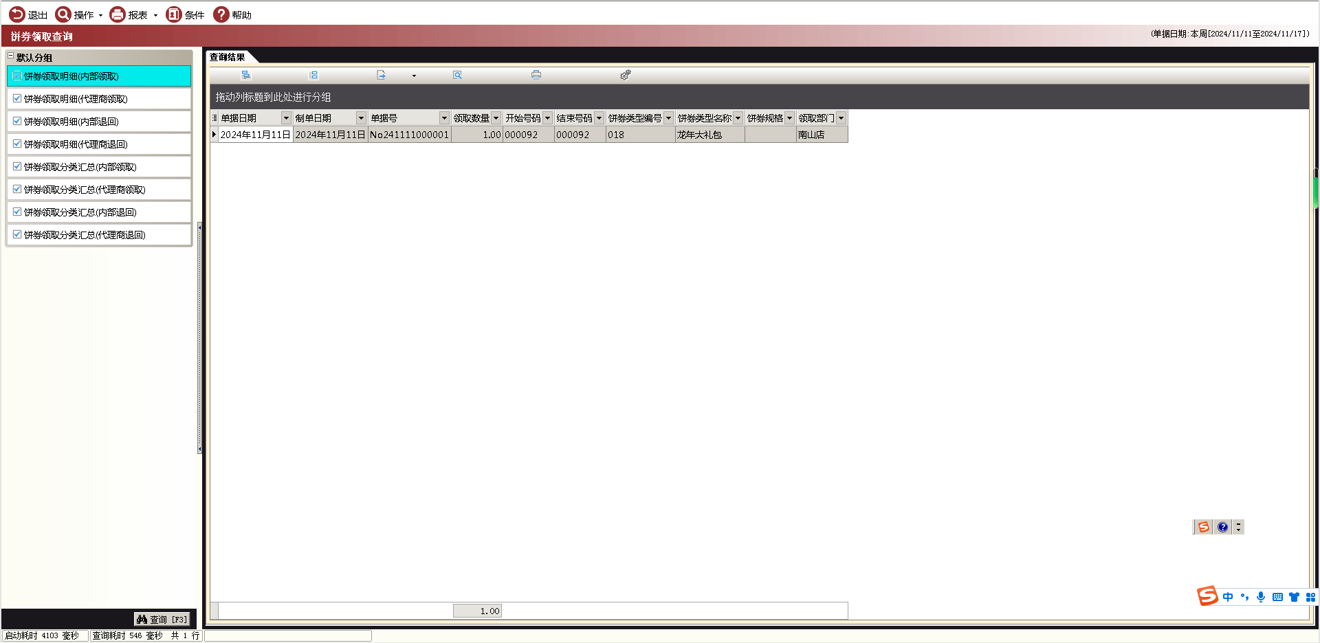 用于查询饼券及其分类的领取与退回情况,涵盖领取时间、数量以及领用部门等关键数据