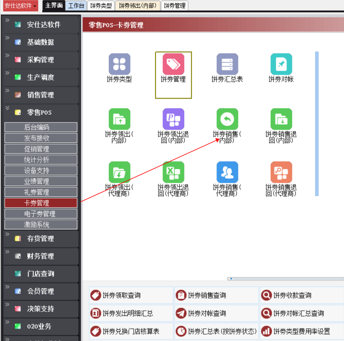 【零售POS】→【卡券管理】→【饼券销售(代理商、内部)】