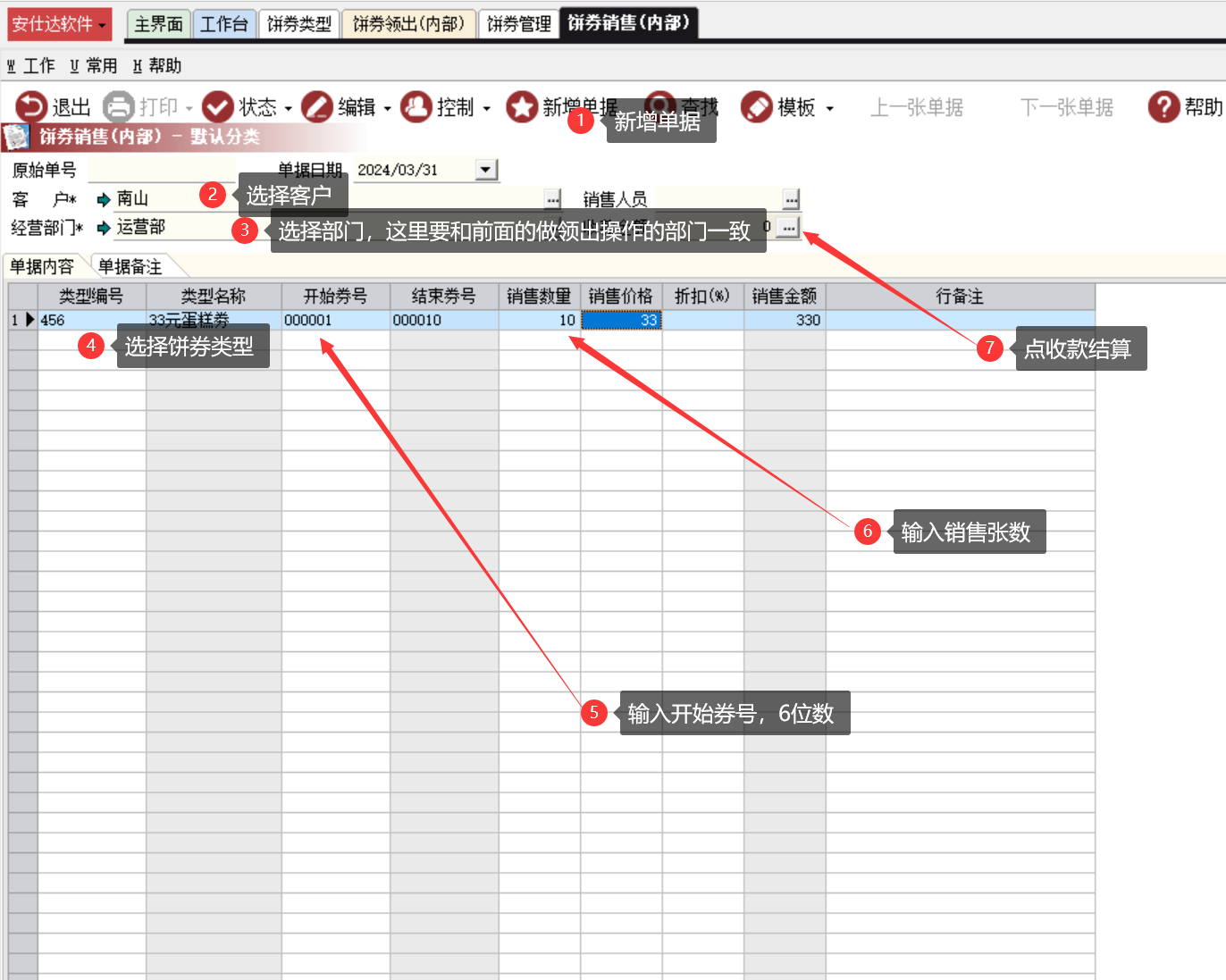 新增饼券销售单据时饼券销售部门与领取饼券号需要对应;