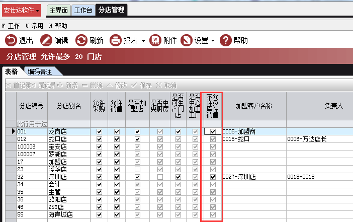 ⑥哪个门店需要控制不允许负数销售的,勾选【不允许负库存销售】即可