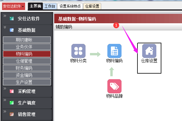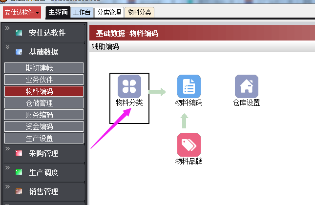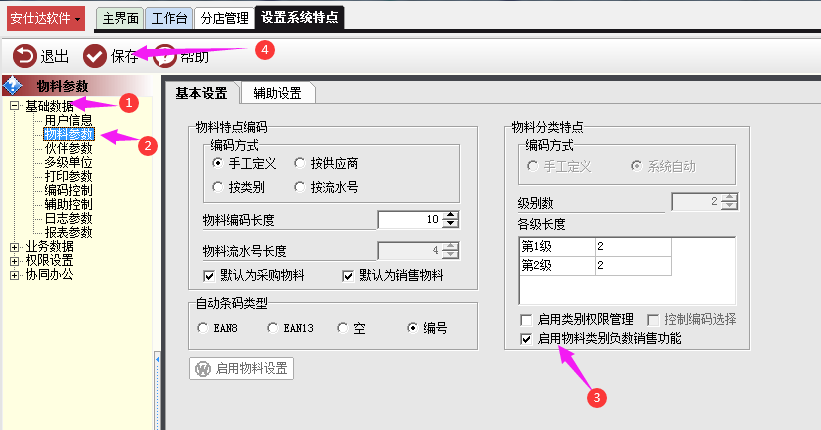 ②展开基础数据,点击物料编码,在基本设置里面,勾选【启用物料类别负数销售功能】,然后点击保存,退出