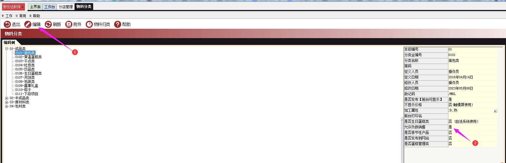 ④在物料分类页面,点击编辑,哪些类别需要控制不允许负数销售的,在右侧【允许负数销售】一栏,设置为【否】即可