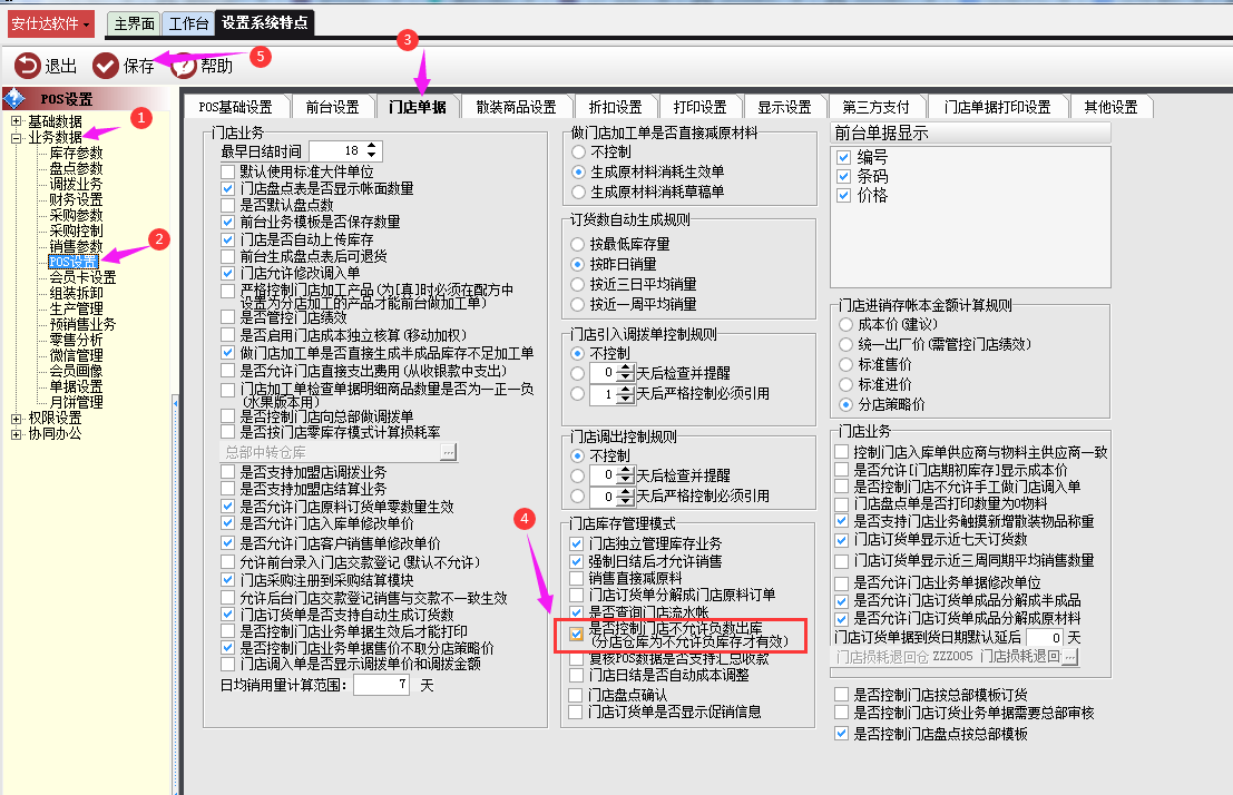 ②展开业务数据,点击POS设置,点击门店单据,勾选【是否控制门店分店不允许负数出库】,然后点击保存,退出