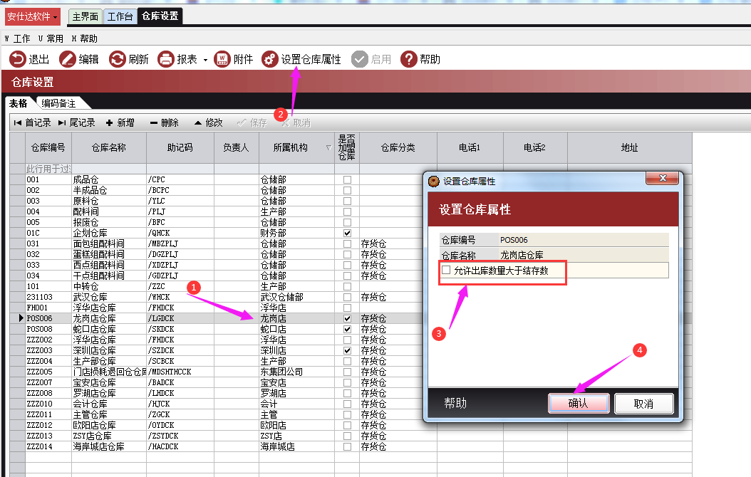④在仓库设置里面,选择门店仓库,点击设置仓库属性,取消勾选【允许出库数量大于结存数】,然后点击确认