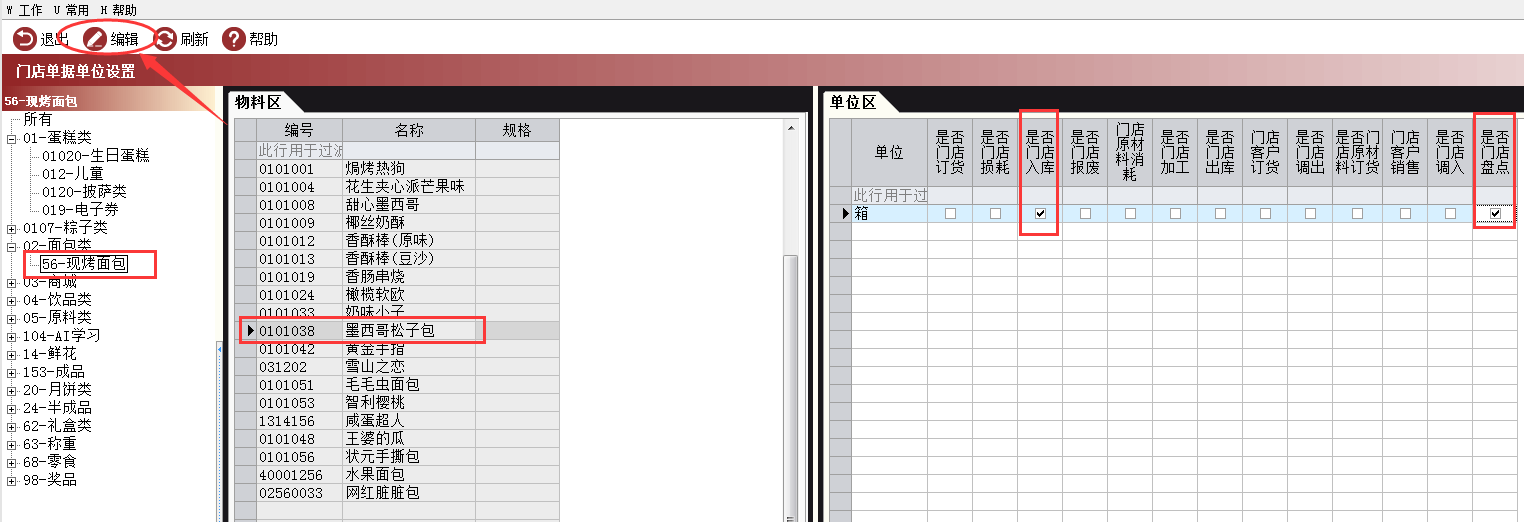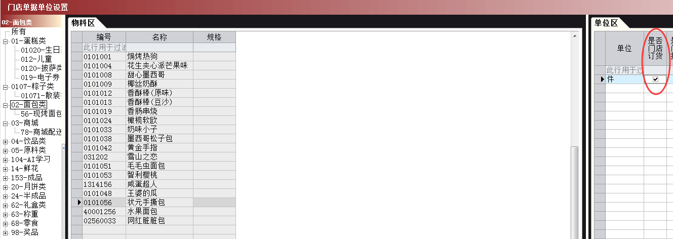 将面包类的状元手撕包设置门店订货单位为大件单位,如下图