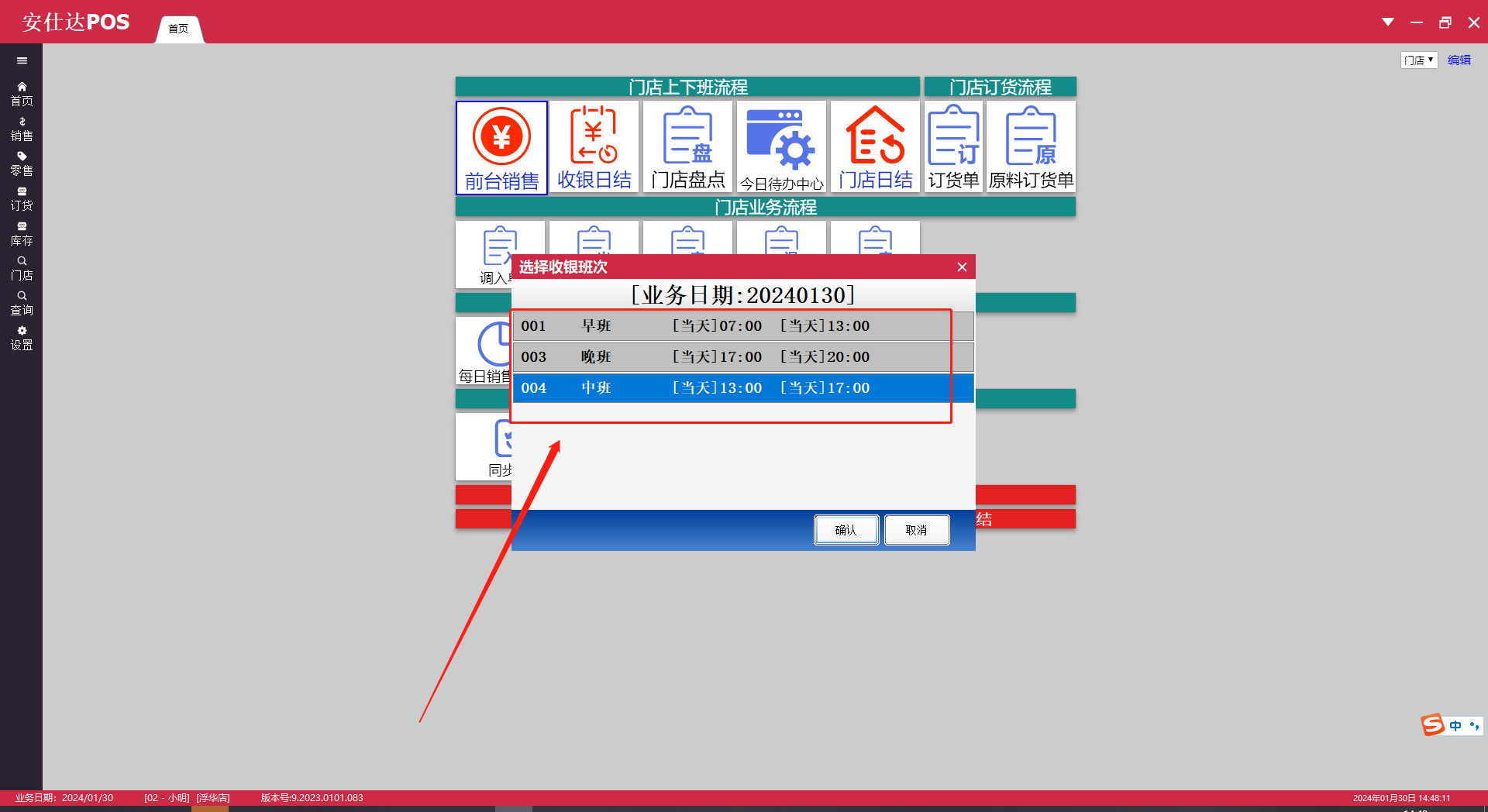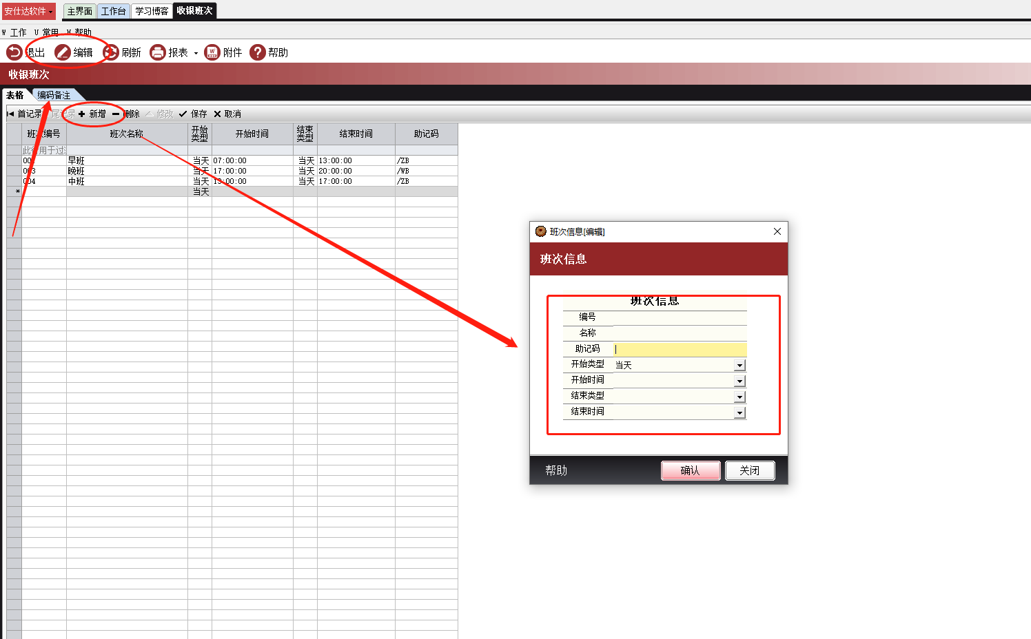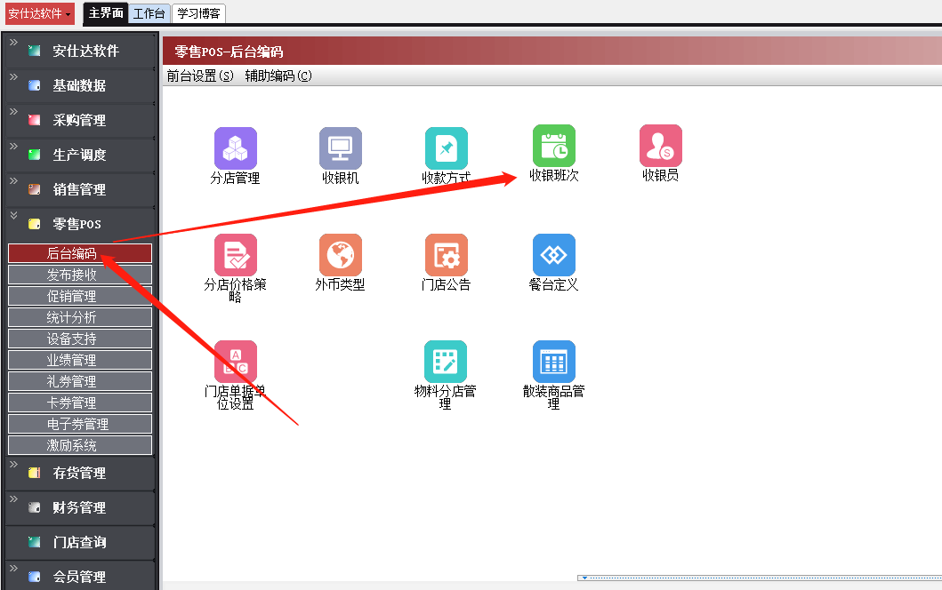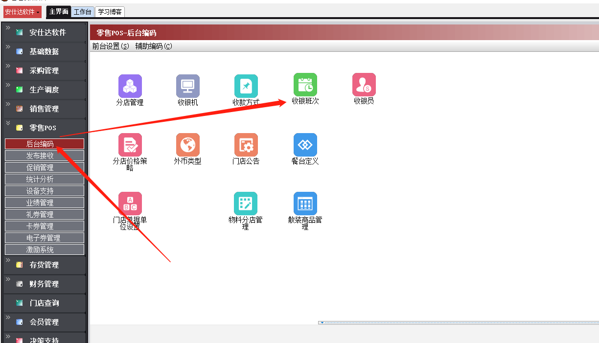 按路径打开收银机界面:零售POS — 后台编码 — 收银班次