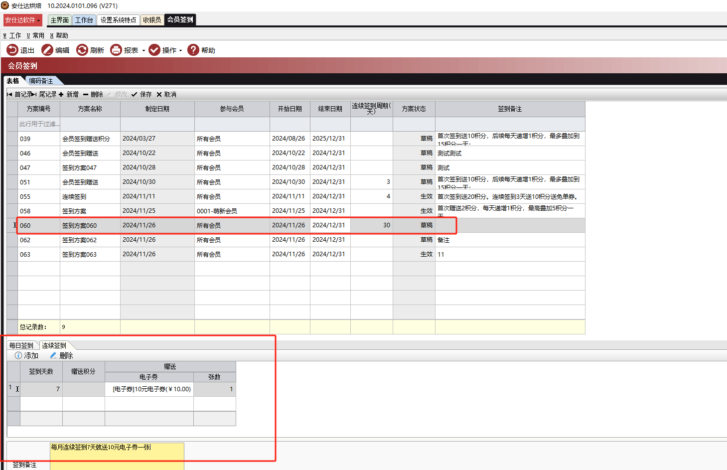 连续签到达到设定的天数后支持送积分或者电子券,也可都送。
