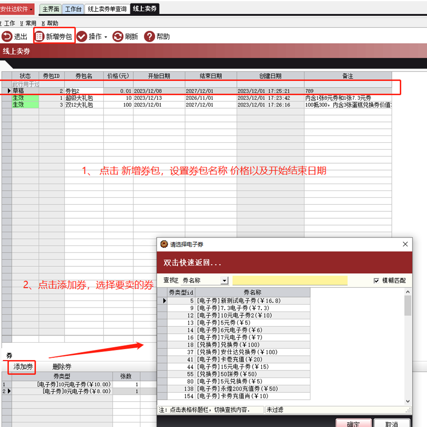 ②点击新增券包,输入券包名称、价格以及开始、结束日期,然后点击添加券,选择要售卖的券,然后输入售卖张数,备注信息等,最后点击操作,生效即可