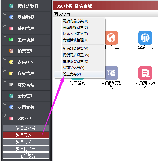 ①按照路径打开线上卖券页面,o2o业务->微信商城->商城设置->线上卖券