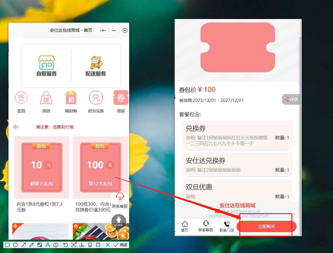 (1)商城售卖券包(一个券包包含多种不同类型的券)