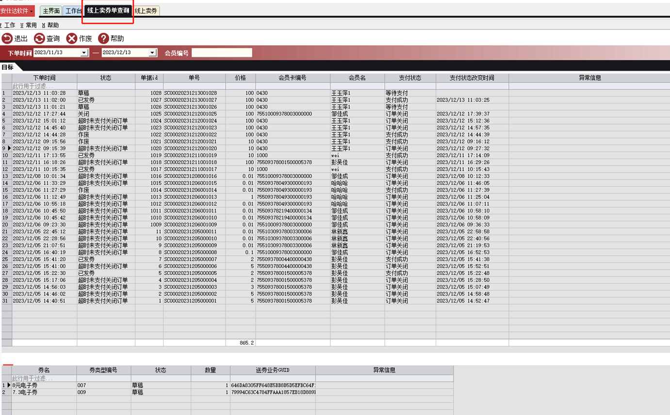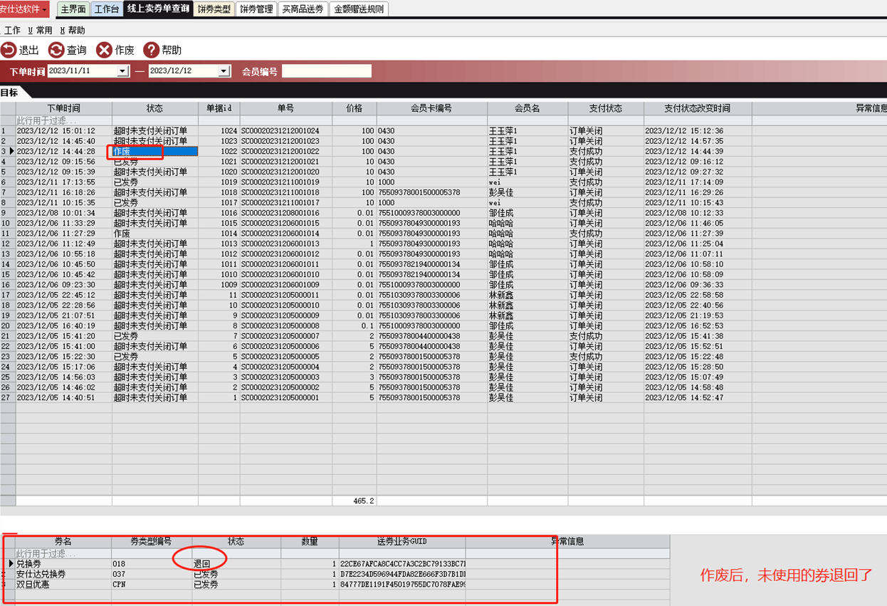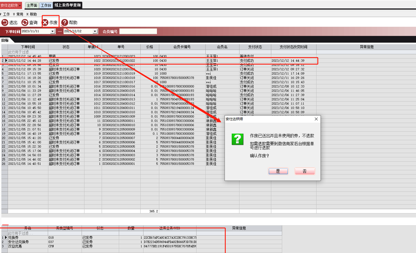 券作废操作:在线上卖券单查询,找到要作废的订单,点击作废,软件会有提示,只作废已送出未使用的券