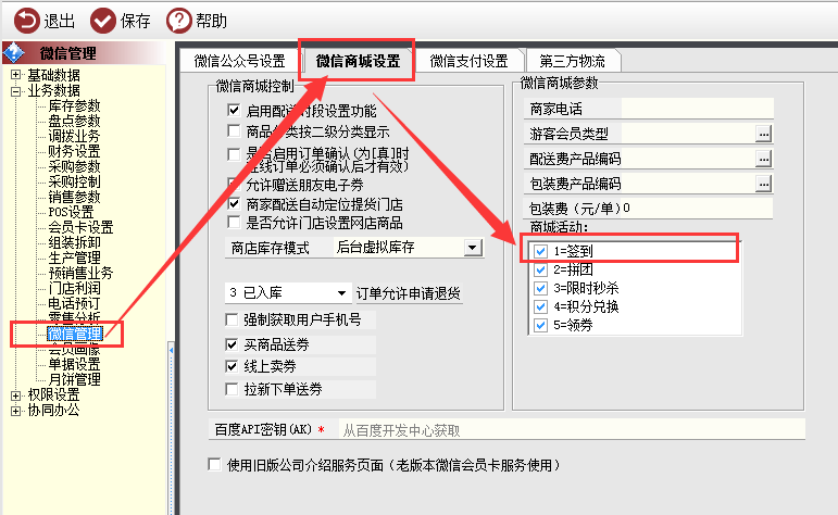 路径:【业务数据】→【微信管理】→【微信商城设置】
