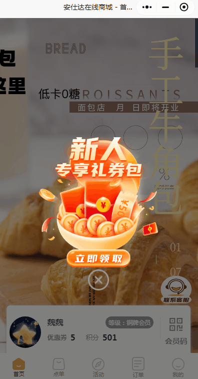 订单详情图片在会员码页面显示,点击【我的】右上方二维码会显示出会员码界面,点击【图片】会跳转到对应的商品上。