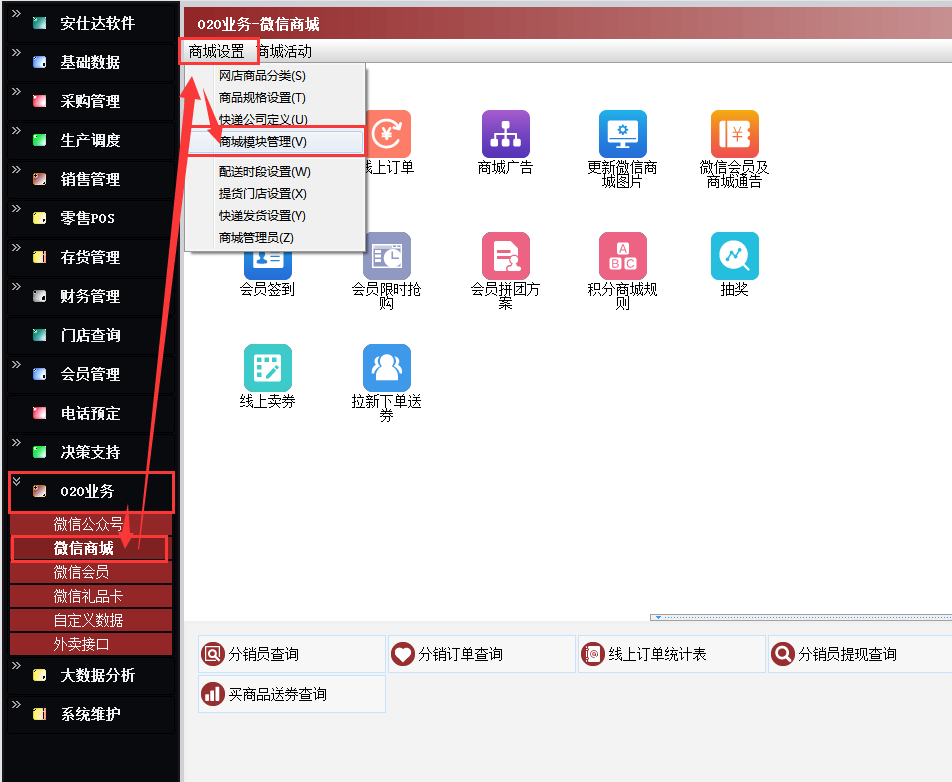 【O2O业务】→【微信商城】→【商城设置】→【商城模块管理】