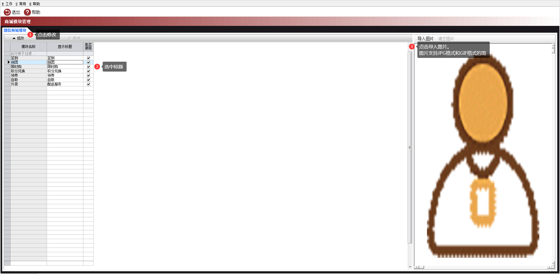 路径:【O2O业务】→【微信商城】→【商城设置】→【商城模块管理】