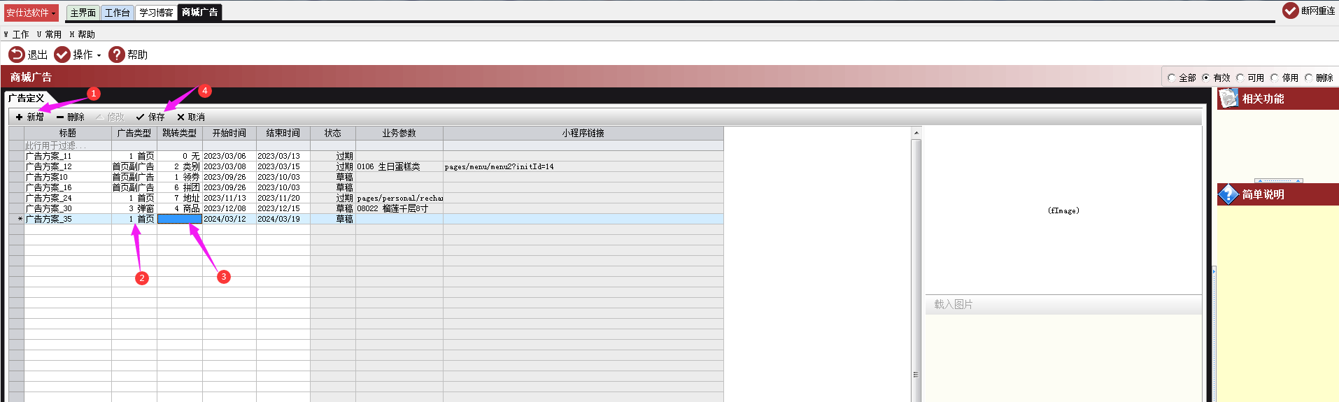 打开商城广告后,点击新增,广告类型选择【首页】,跳转类型表示要跳转到哪里,如果需要跳转到对应商品这里就选择商品,不需要跳转则选择无,然后点击保存