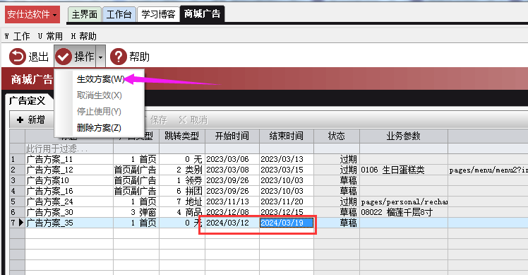 设置好首页广告方案展示的时间,然后点击操作,在点击生效方案即可
