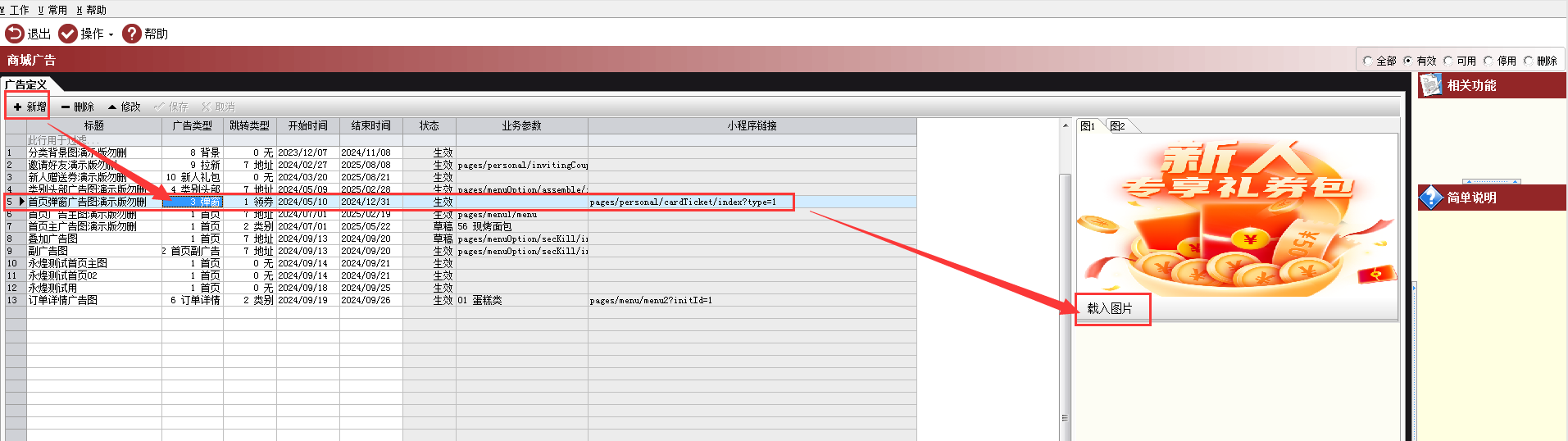 路径:【O2O业务】→【微信商城】→【商城广告】