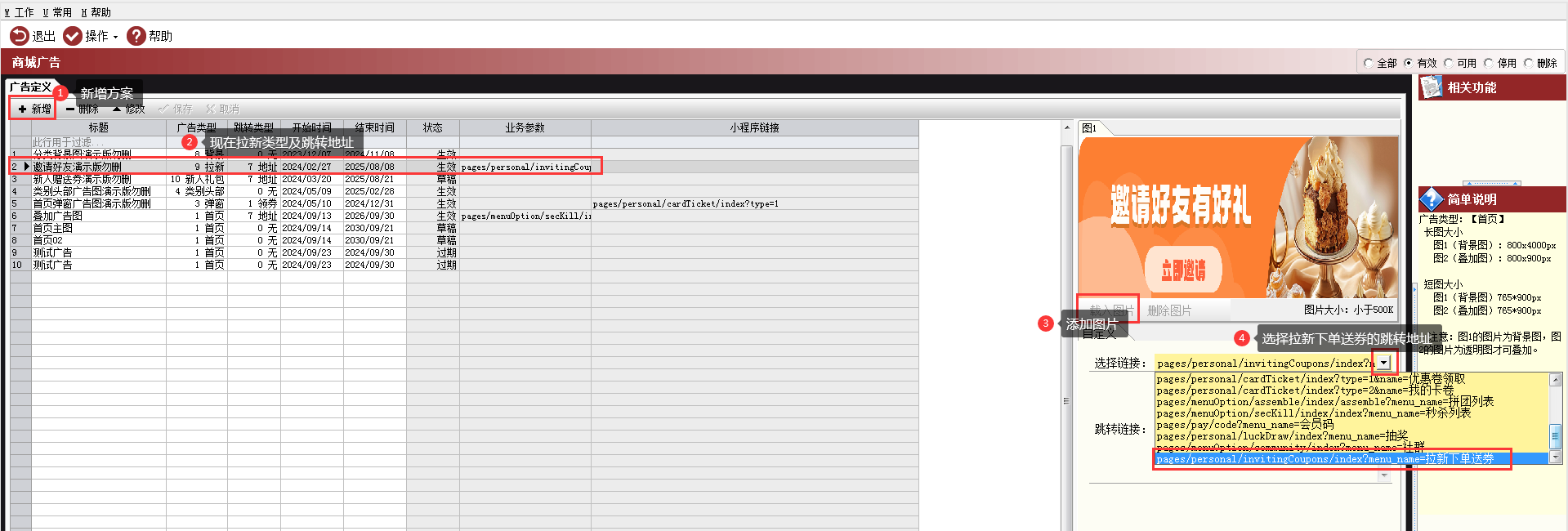 路径:【O2O业务】→【微信商城】→【商城广告】