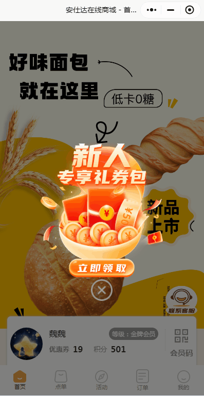 小程序效果:【首页】以及【个人中心】以广告图的方式展示,通过点击广告图可以跳转拉新界面。